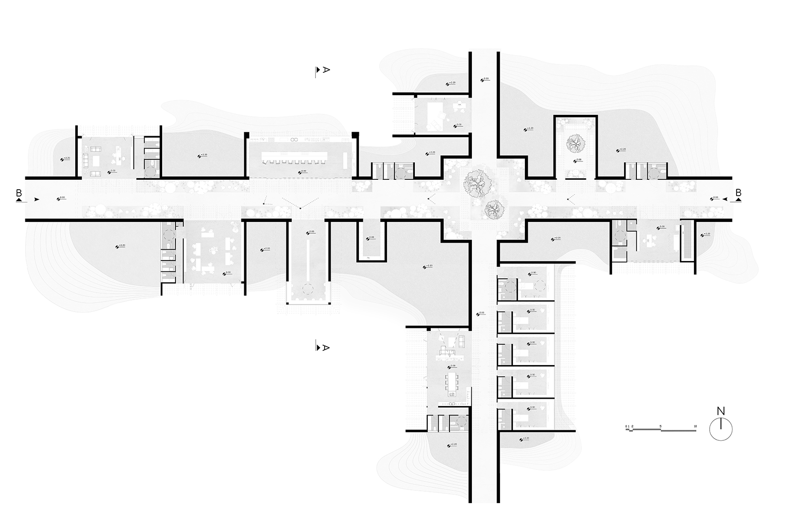 Κατά μήκος αυτών των αξόνων, κυβικοί όγκοι αναδύονται ως ξεχωριστές λειτουργικές μονάδες. Ο οριζόντιος άξονας φιλοξενεί τον χώρο υποδοχής, τον χώρο συγκέντρωσης, την κουζίνα, τη βιβλιοθήκη, ένα δωμάτιο για πνευματική περισυλλογή και έναν ιατρικό χώρο. Ο κάθετος άξονας φιλοξενεί το δωμάτιο του ψυχολόγου, τα δωμάτια του προσωπικού και έναν κοινόχρηστο χώρο για το προσωπικό. Αυτοί οι δύο άξονες δεν έχουν σχεδιαστεί ως κλειστοί διάδρομοι, αλλά ως ανοιχτοί διάδρομοι: ψηλοί, γραμμικοί χώροι χωρίς στέγες, που αποκαλύπτουν τον ουρανό από πάνω. Δεν είναι εσωτερικά μονοπάτια, αλλά εξωτερικές επεκτάσεις του τοπίου. Ευθυγραμμίζοντάς τα με την πορεία του ήλιου από ανατολή προς δύση, η αρχιτεκτονική μπαίνει σε έναν καθημερινό διάλογο με τον ίδιο τον χρόνο.