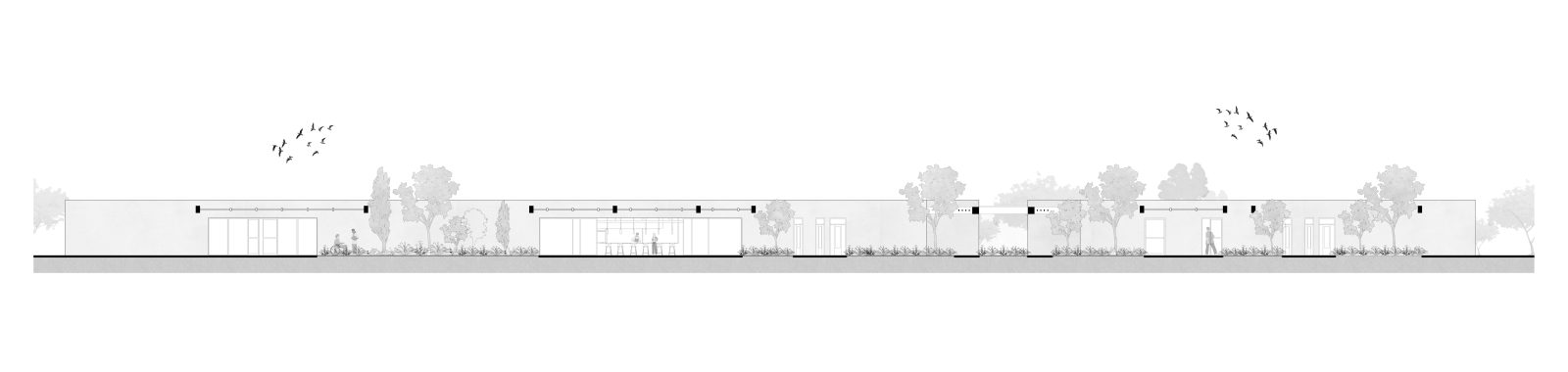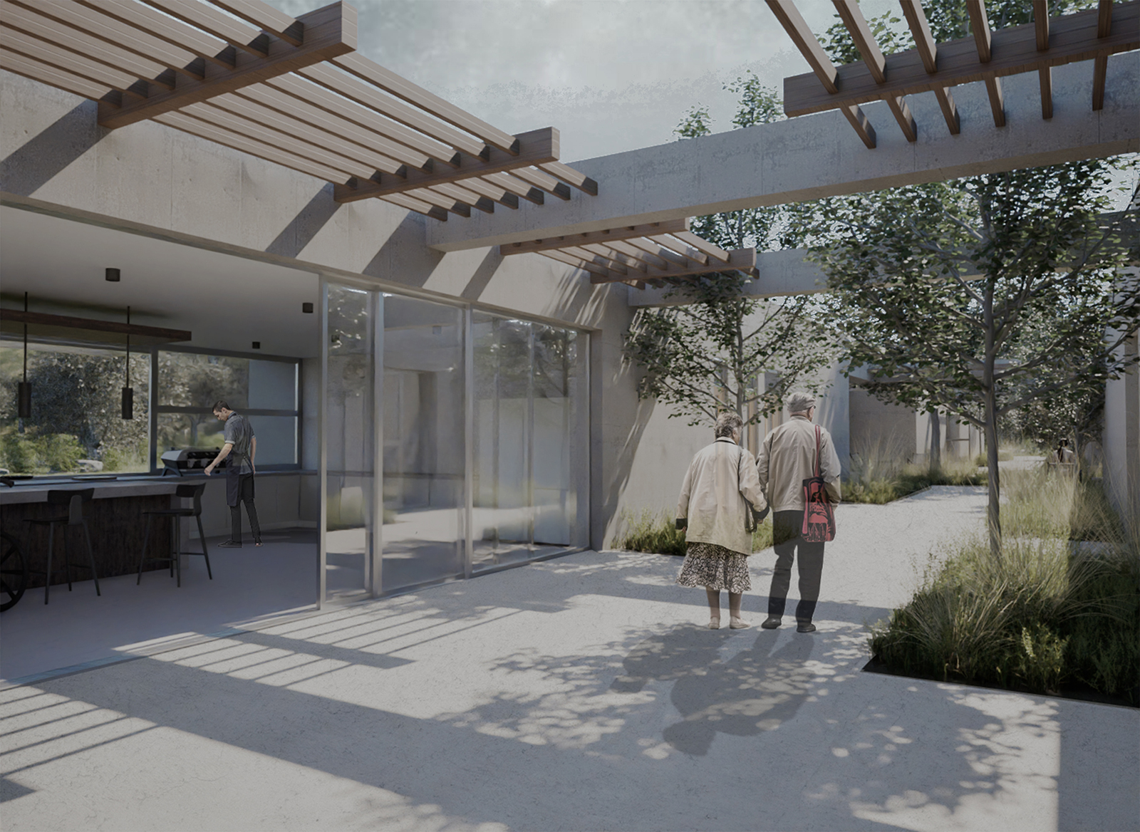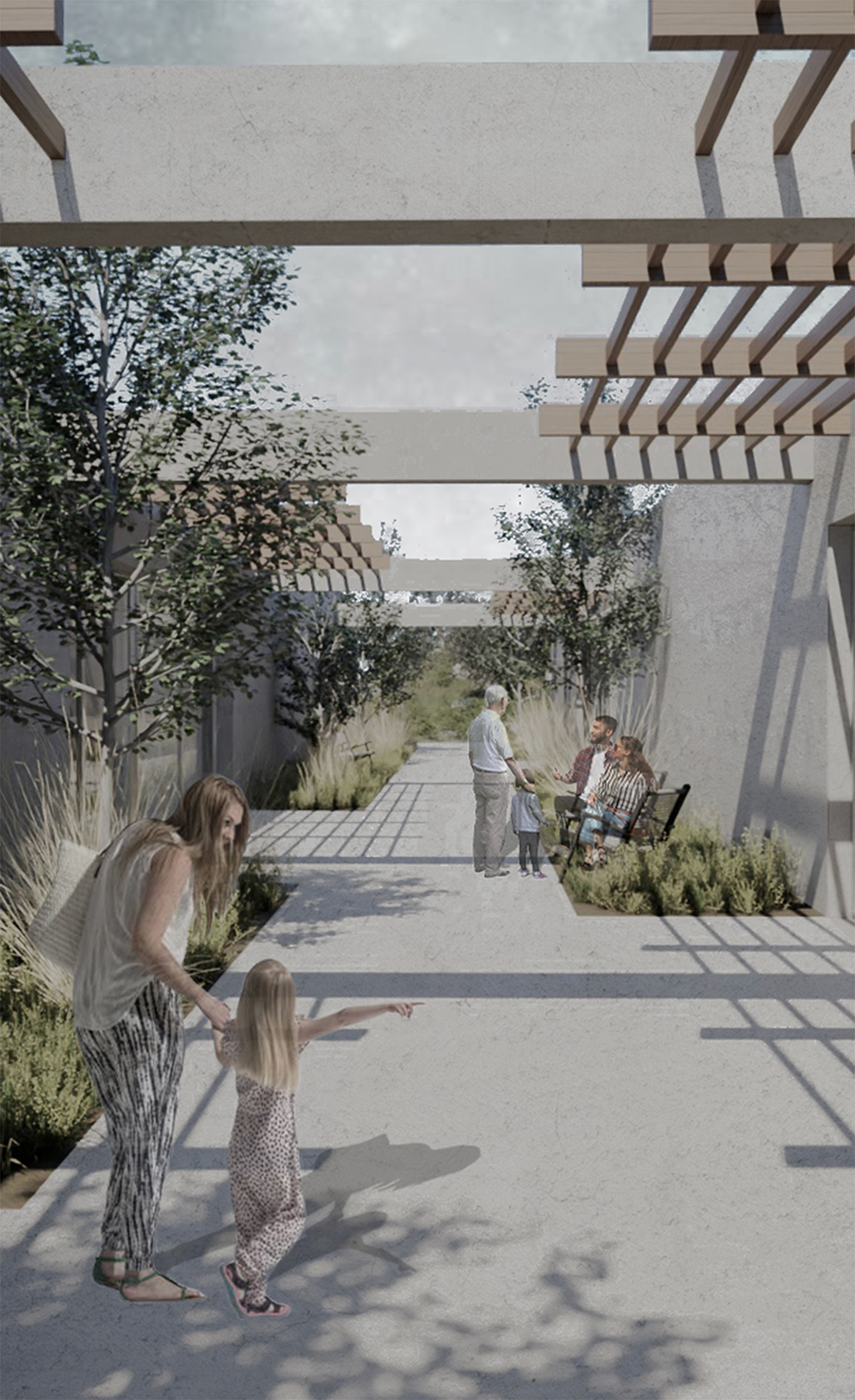 Earth is placed on the roofs, not to bury, but to blur the boundary between structure and landscape making the building disappear into the olive grove, making presence indistinguishable from terrain. This project re imagines the hospital corridor and the clinical room. It replaces walls with trees, ceilings with sky, and fluorescent lights with sunlight.
