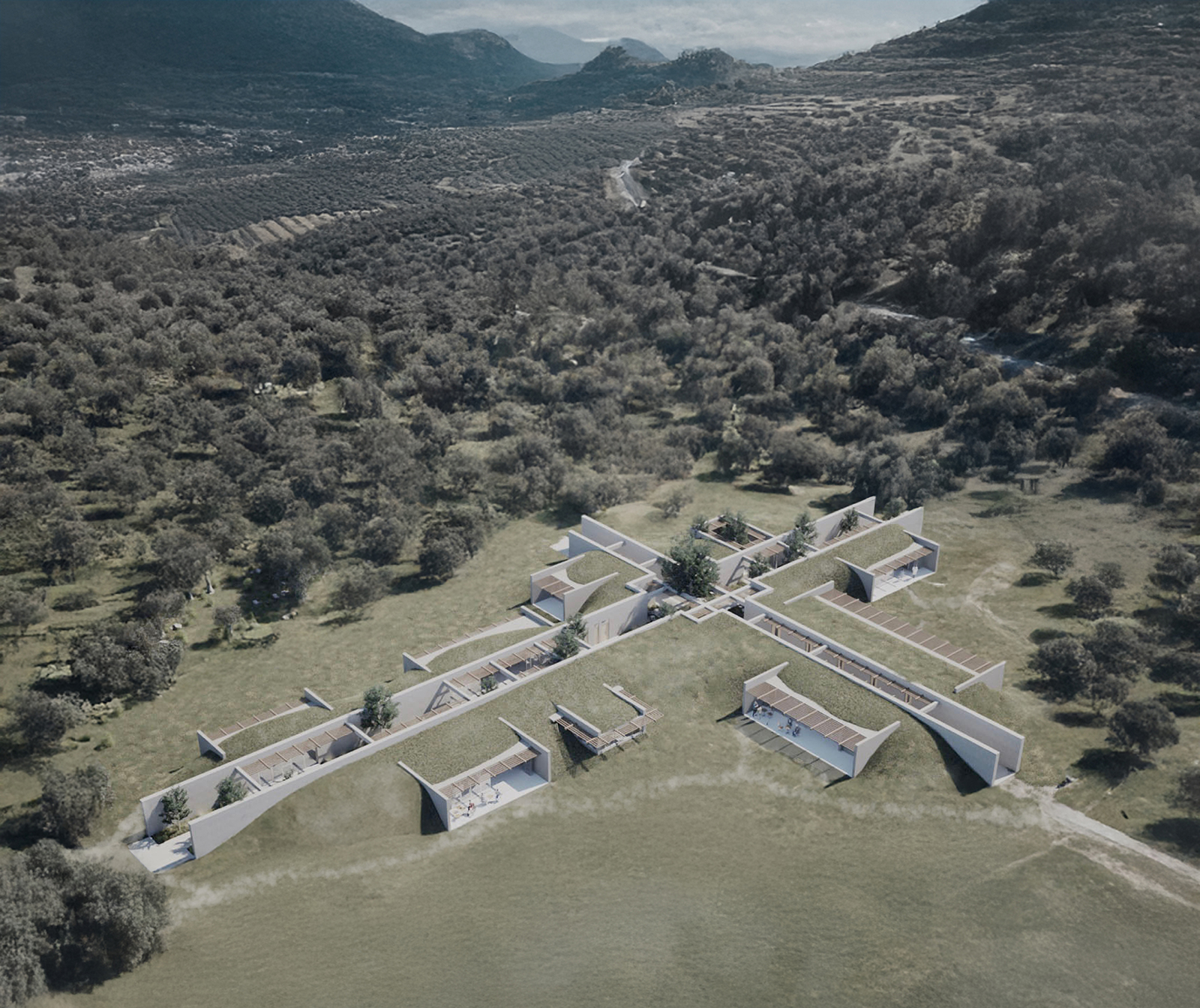 The visitor, moving through these axes, experiences the sun rising, setting, casting shadows, changing sea- sons the essence of nature passing slowly and truthfully. The project is situated in the heart of a Mediterranean olive grove, a landscape deeply rooted in cultural memory, slowness, and care.