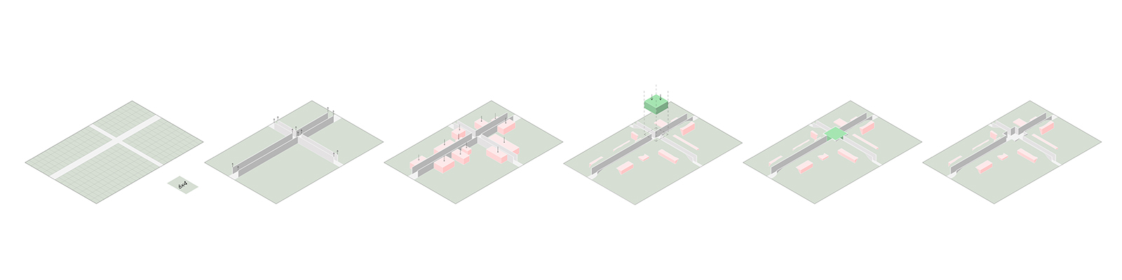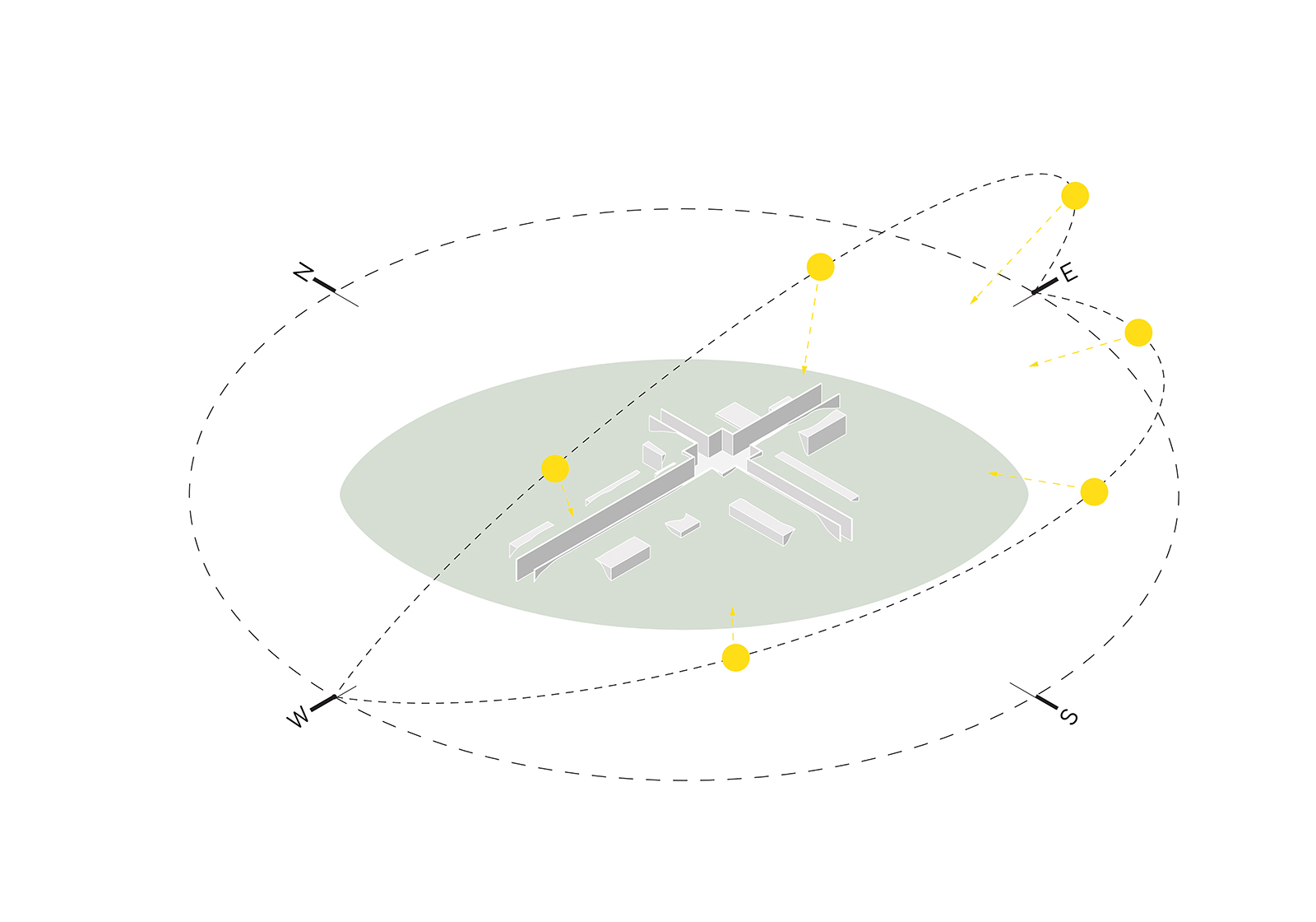 Along these axes, cubic volumes emerge as distinct functional units. The horizontal axis hosts the welcoming space, the gathering area, the kitchen, the library, a room for spiritual reflection, and a medical space. The vertical axis accommodates the psychologist’s room, staff housing, and a staff common area. These two axes are conceived not as enclosed corridors, but as open-air passageways: tall, linear spaces without roofs, revealing the sky above. They are not interior paths, but outdoor extensions of the landscape. By aligning them with the sun’s path from east to west the architecture enters into a daily dialogue with time itself.