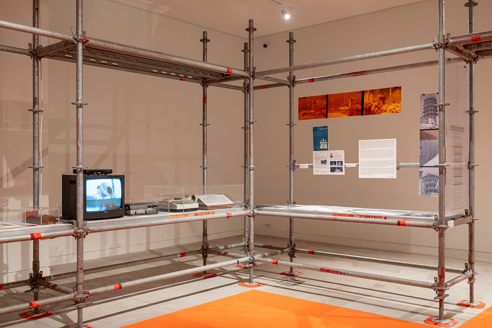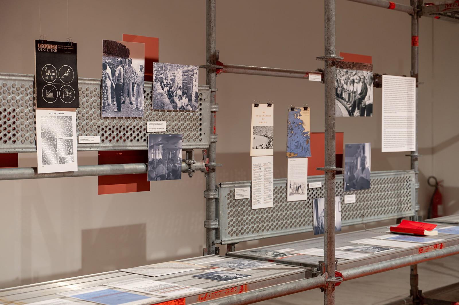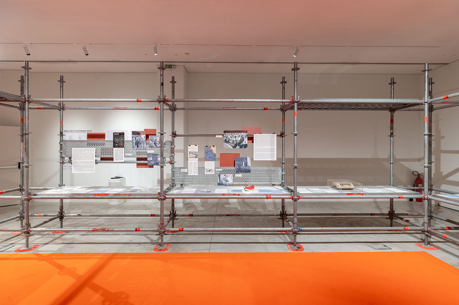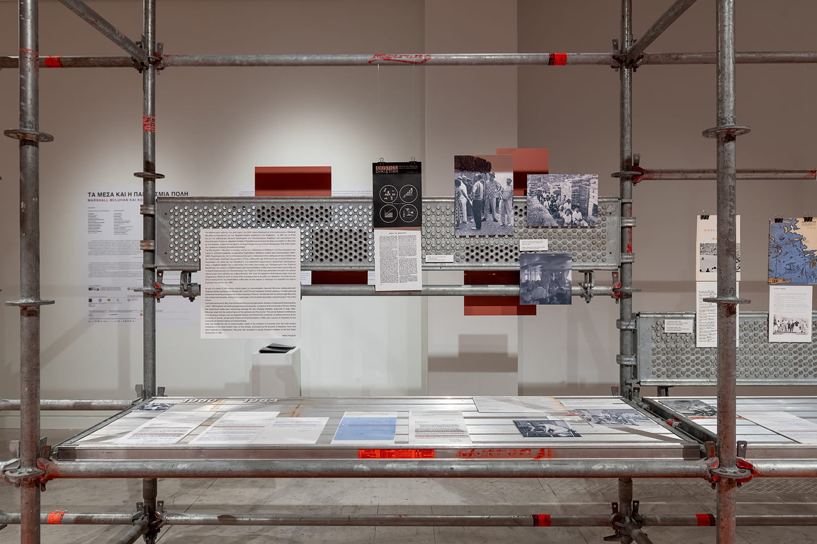 The scaffolding is placed at the center of the space, forming an interior open space that invites visitors to pause, read, and communicate. Upon and within this spatial network, the creative collaboration between McLuhan and Doxiadis unfolds. Documents, correspondence, and photographs are arranged chronologically, following the evolution of their relationship, while drawings, telecommunication equipment, books, periodicals, press publications, as well as audio and visual materials, enrich the display with information and insights into their work on networks and telecommunications.