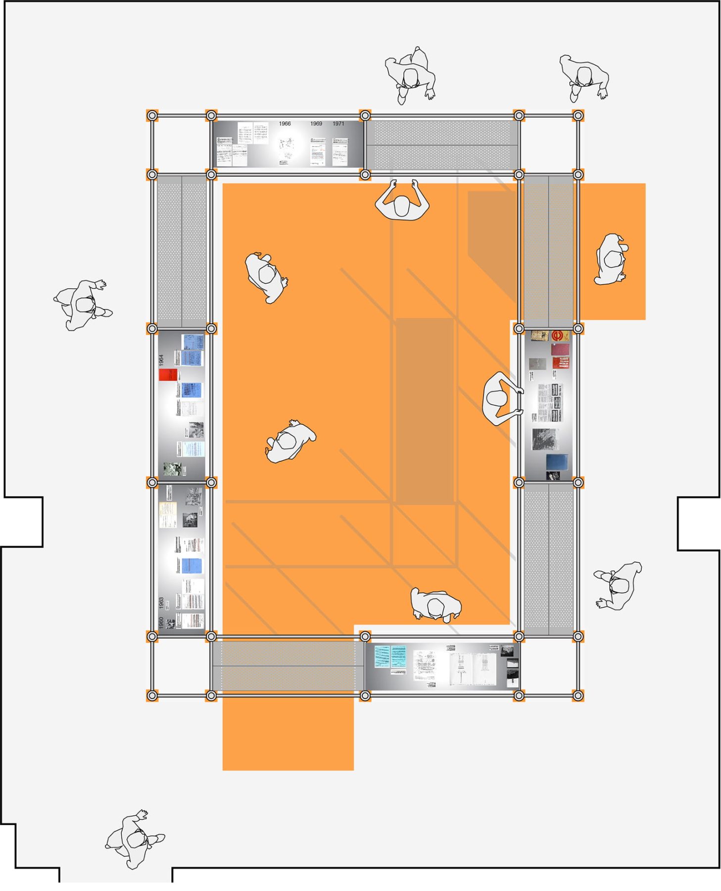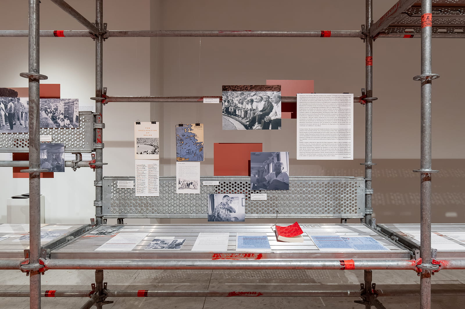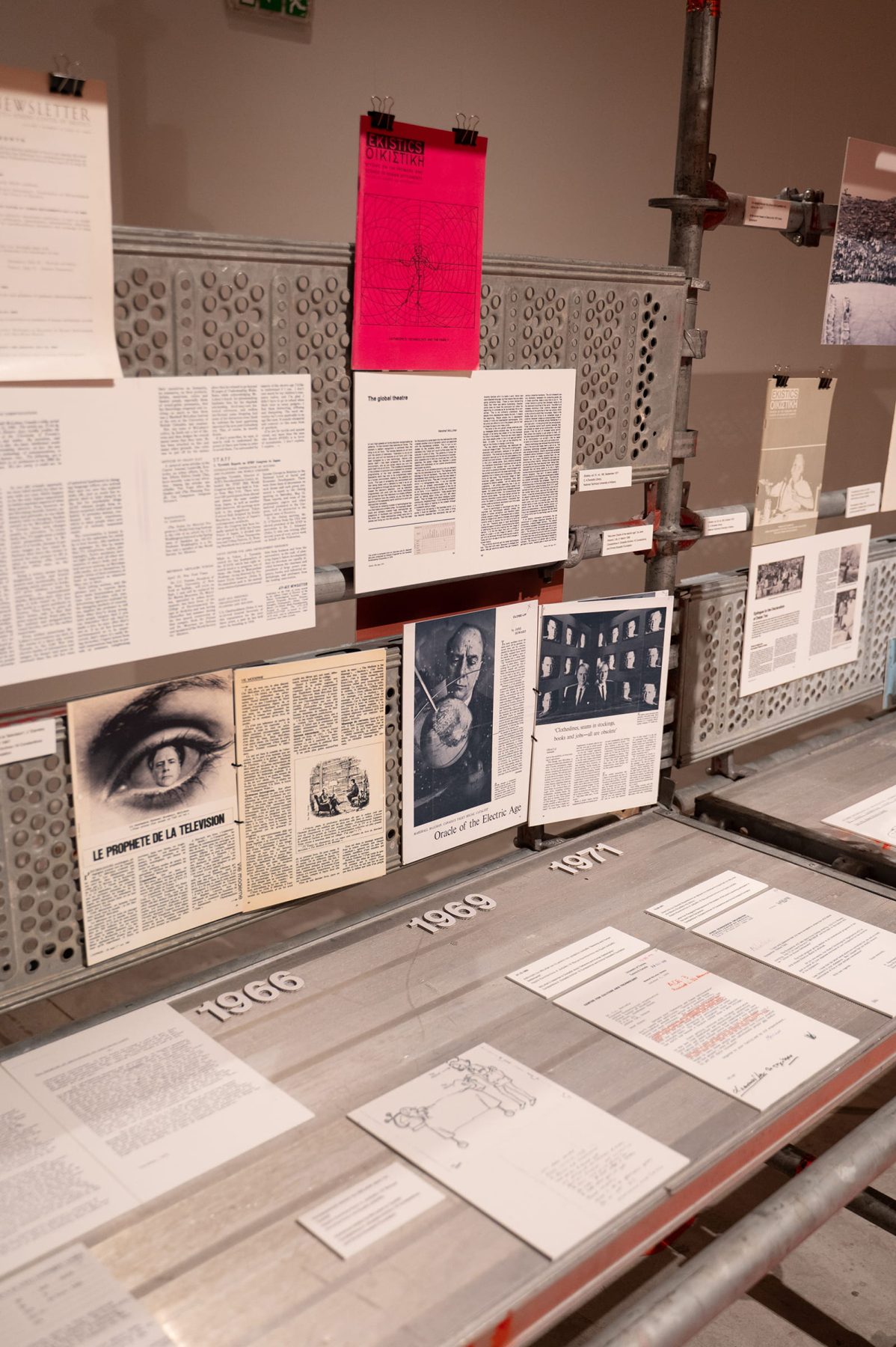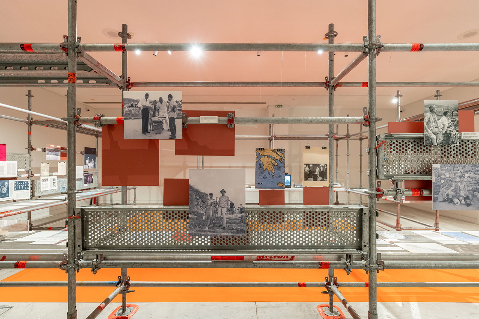 The scaffolding is placed at the center of the space, forming an interior open space that invites visitors to pause, read, and communicate. Upon and within this spatial network, the creative collaboration between McLuhan and Doxiadis unfolds. Documents, correspondence, and photographs are arranged chronologically, following the evolution of their relationship, while drawings, telecommunication equipment, books, periodicals, press publications, as well as audio and visual materials, enrich the display with information and insights into their work on networks and telecommunications.