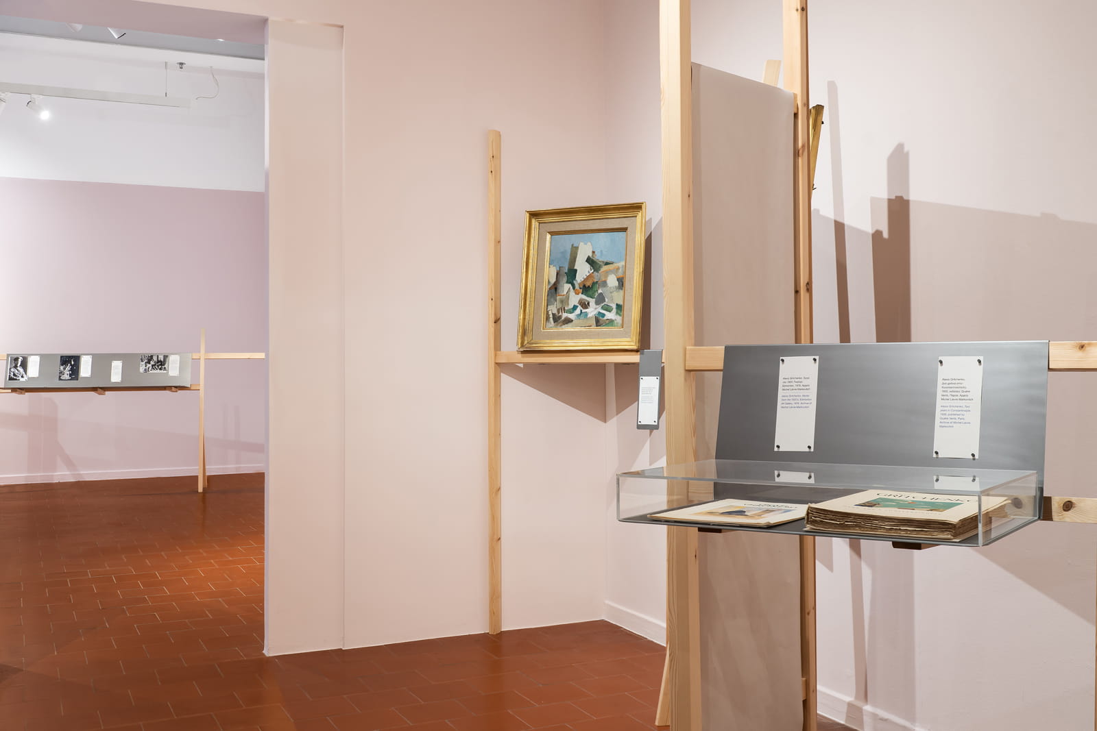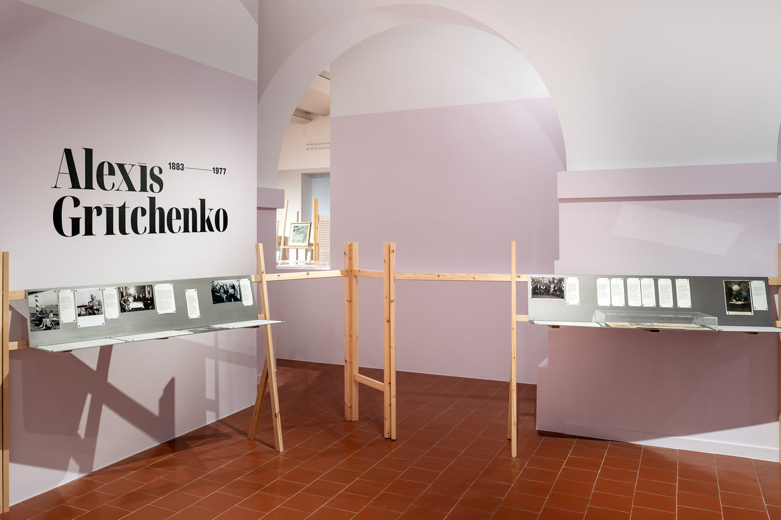 At selected points, surfaces of bent sheet metal suspended from the wooden structures incorporate elements and documents from Gritchenko’s life and artistic journey, while excerpts from his theoretical writings function as interpretive layers that enrich the narrative.