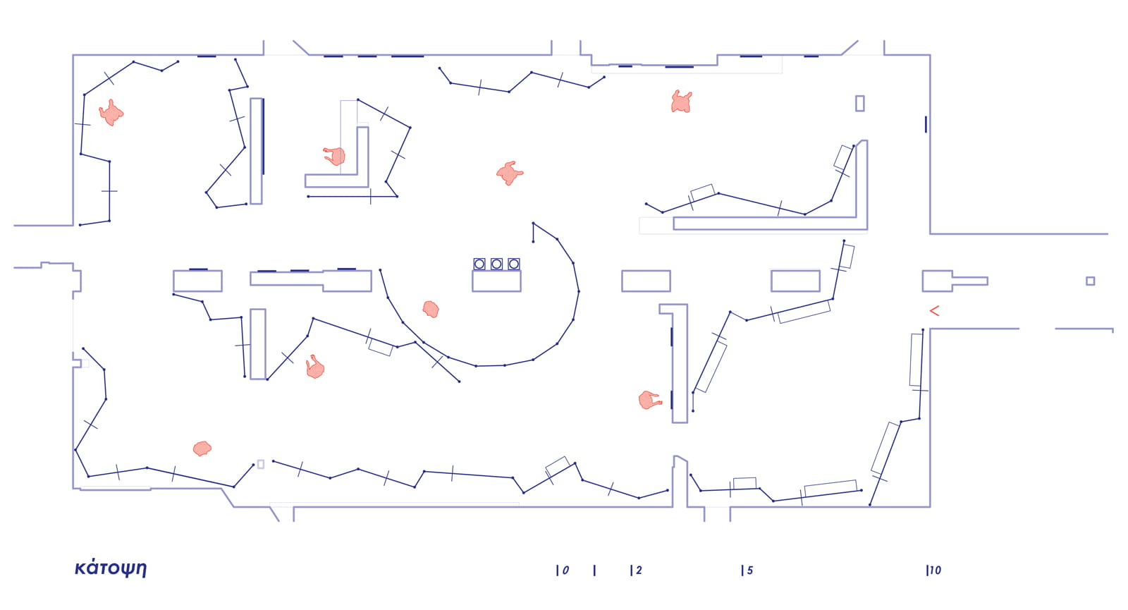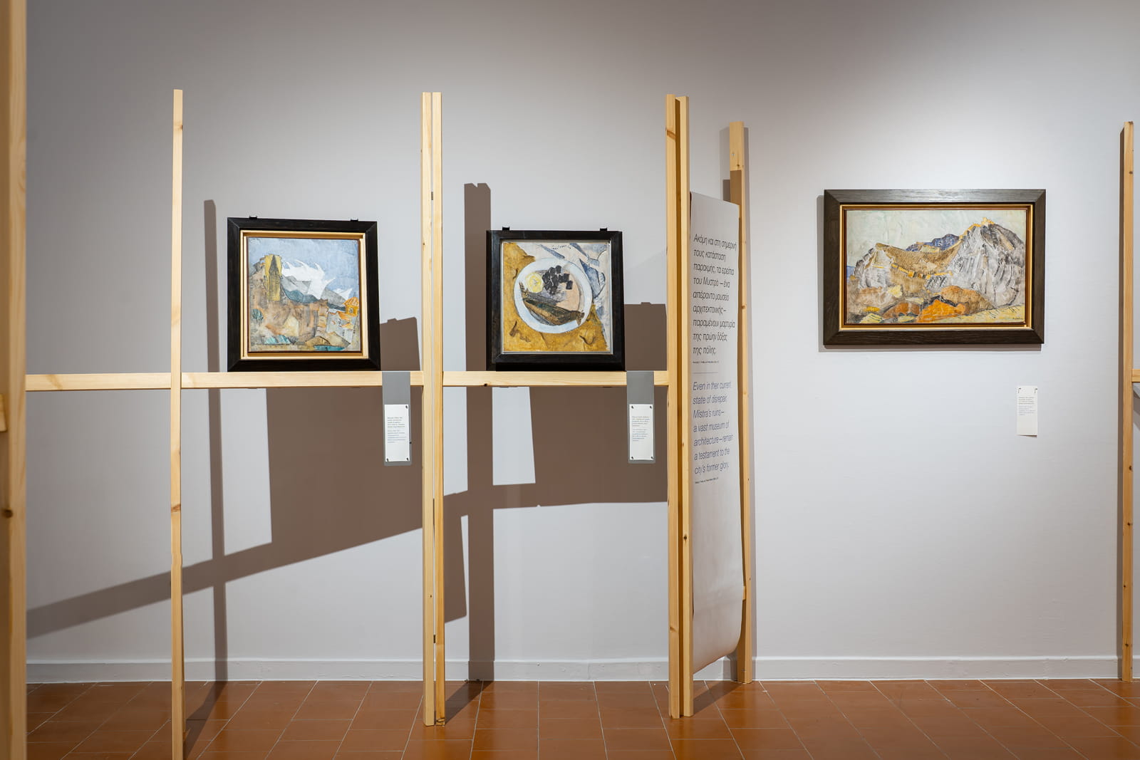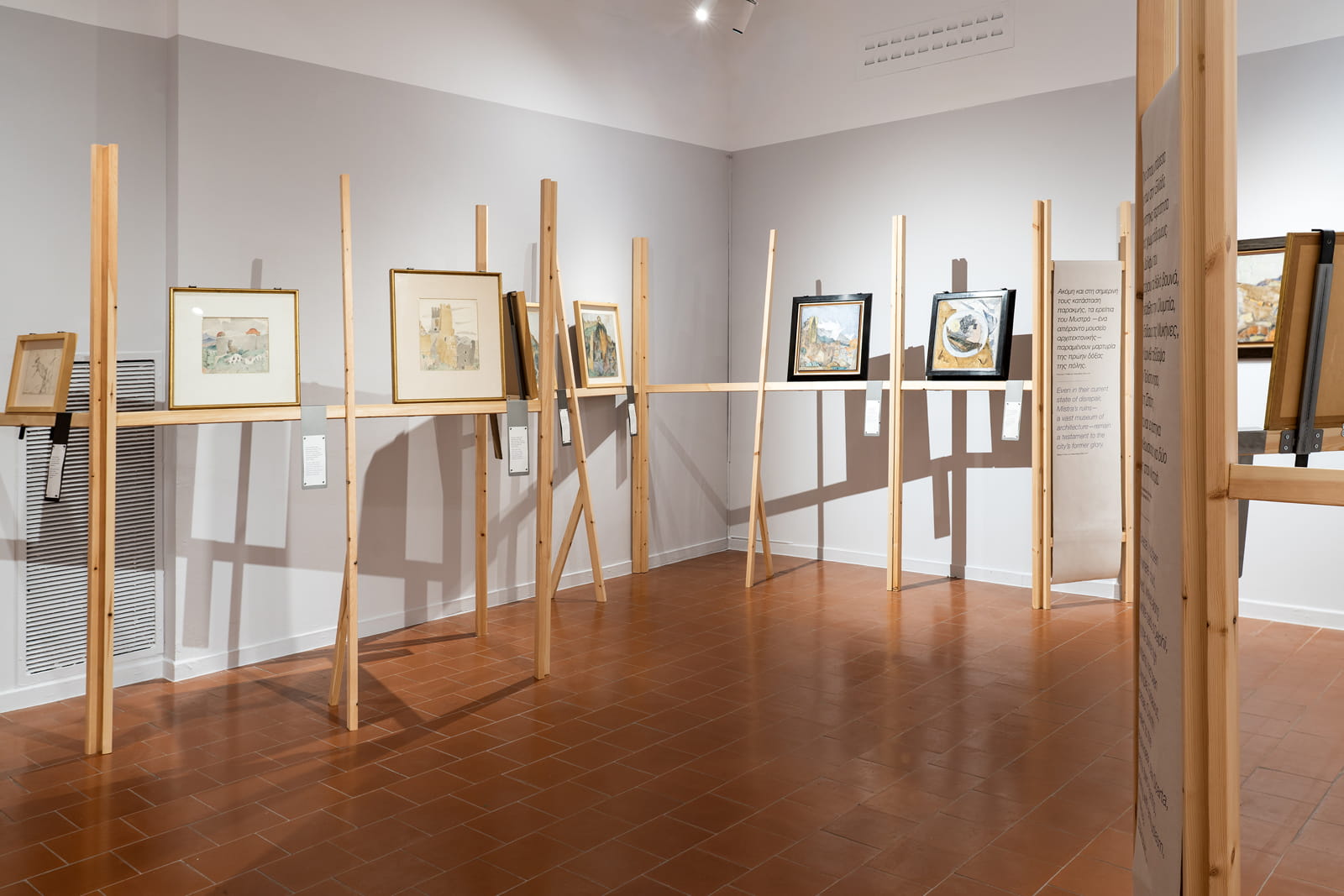 The thirteen linear structures displaying the exhibition’s eighty-three works form a unified spatial field, organizing the narrative flow within the perceptually fragmented exhibition space on the first floor of the Moni Lazariston.