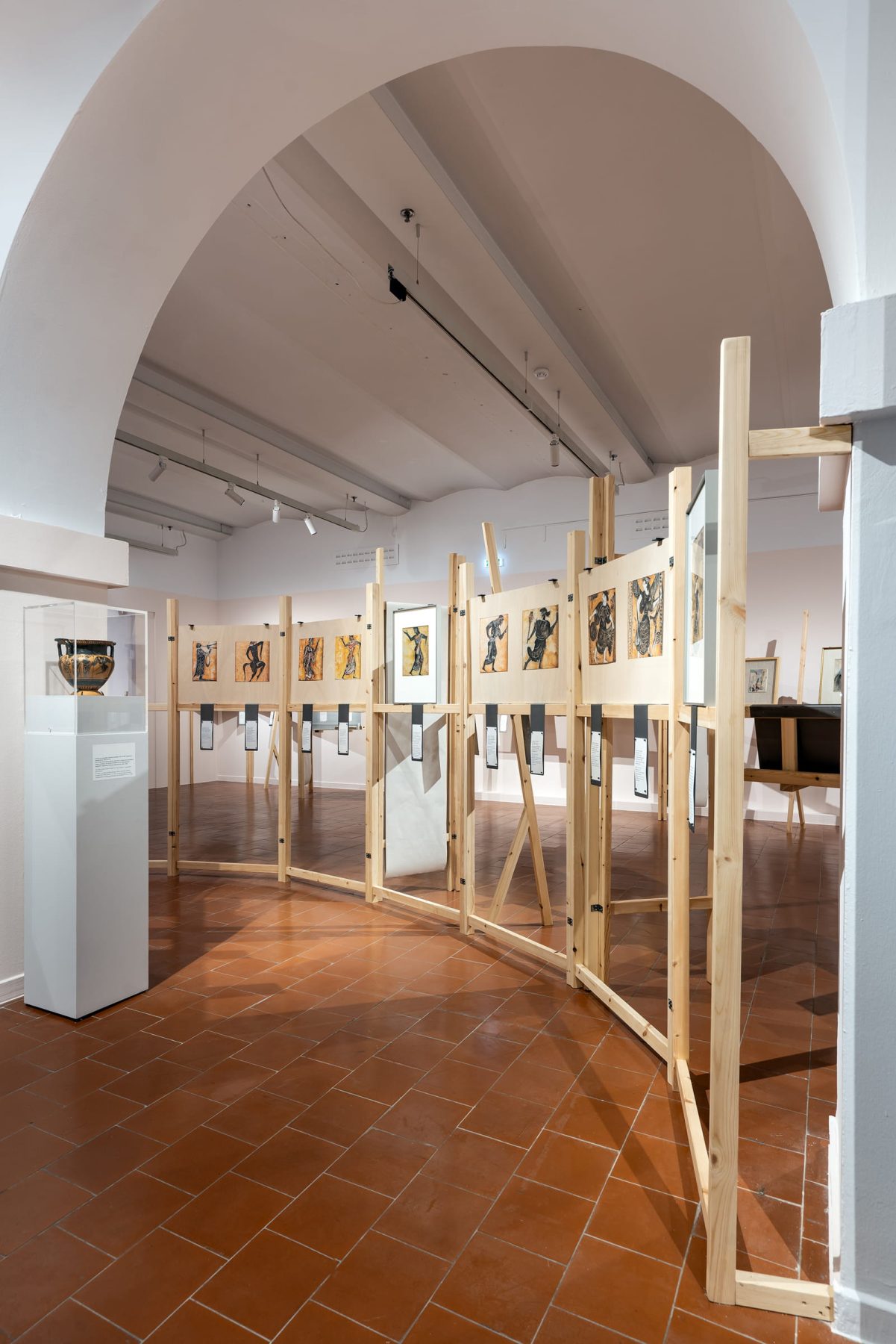 Using the same architectural vocabulary, the installation for the “Dancers” section unfolds in a circular formation at the center of the exhibition space, evoking a ring dance. This arrangement enhances the sense of movement and the dialogue between the works themselves, as well as their interaction with three vessels from the permanent collection of the Archaeological Museum of Thessaloniki. These are works the artist created primarily for his own pleasure, attempting a visual dialogue with Greek antiquity through the language of modern avant-garde art.