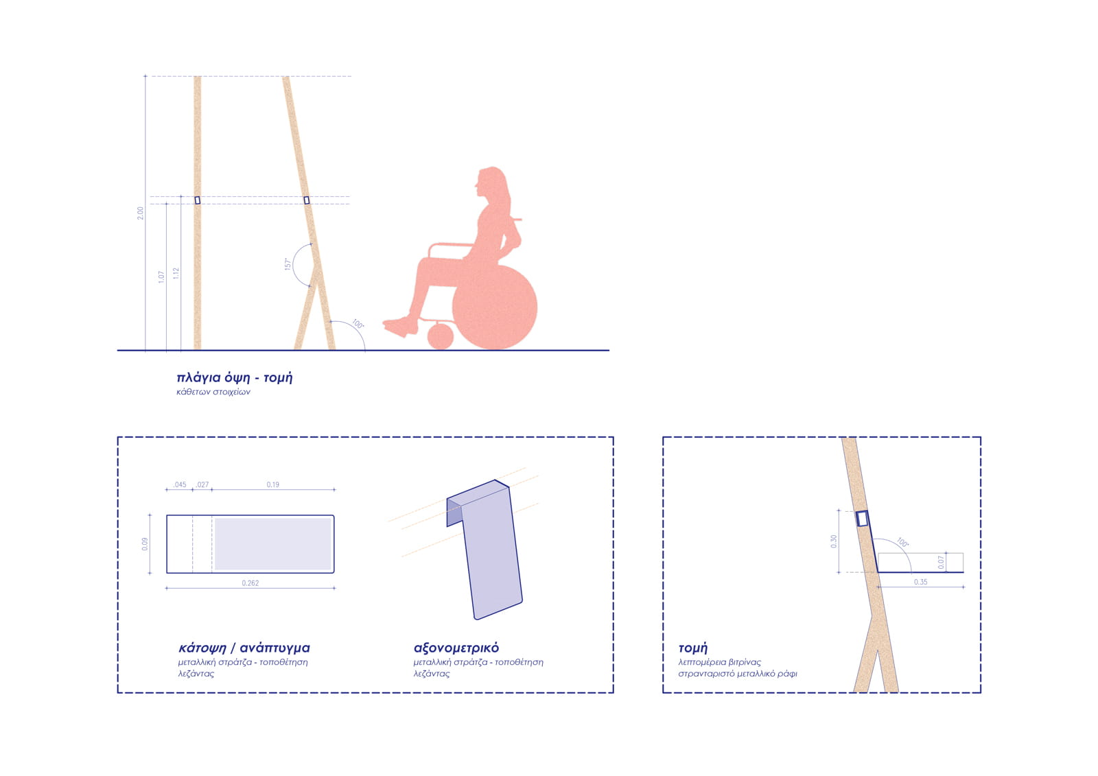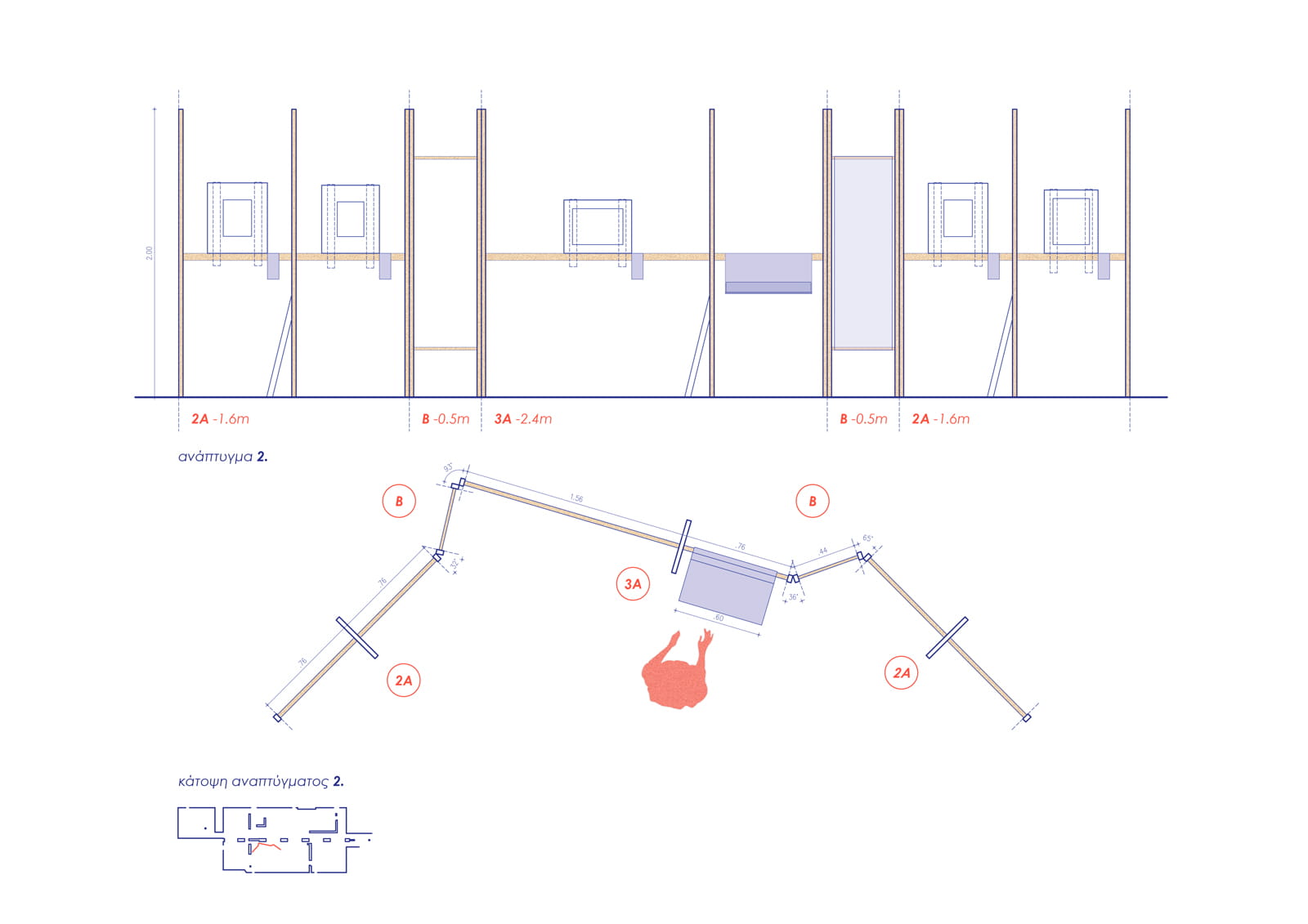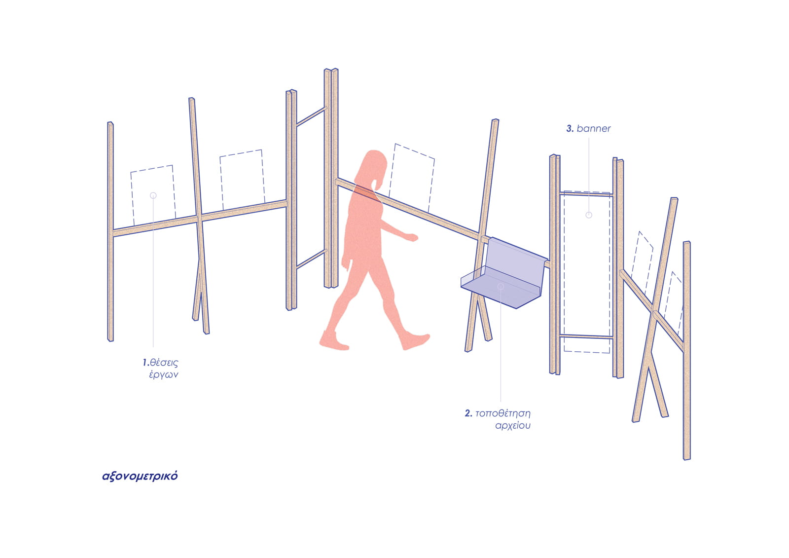 Κεντρική ιδέα της εγκατάστασης αποτελεί η ανάπτυξη μιας αρθρωτής κατασκευής από ξύλο έλατου, η οποία παραπέμπει τυπολογικά στο καβαλέτο.