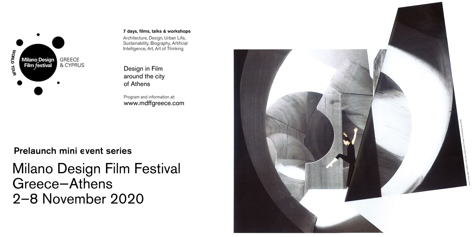 The prelaunch mini-event series, curated by MDFF Greece, will take place on 2 — 8 November, 2020, in collaboration with public and private organisations in Athens, presenting a rich content of screenings, discussions, workshops, bike routes and walking tours with an underlying architectural theme.