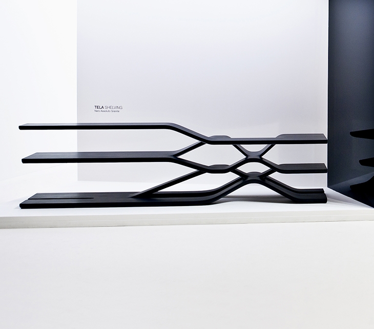 Tela is a shelving system characterised by an interesting dichotomy: the solidity of the black granite of which it is composed seemingly dissipates with the elongated cantilevers. At the centre of the configuration, its structural core, are the interweaved shelves which appear to open and unfold from a single surface to follow parallel trajectories. The design integrates the powerful dynamic forces inherent to cantilevered systems.