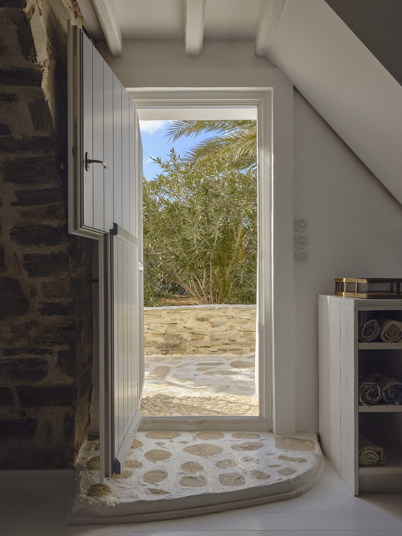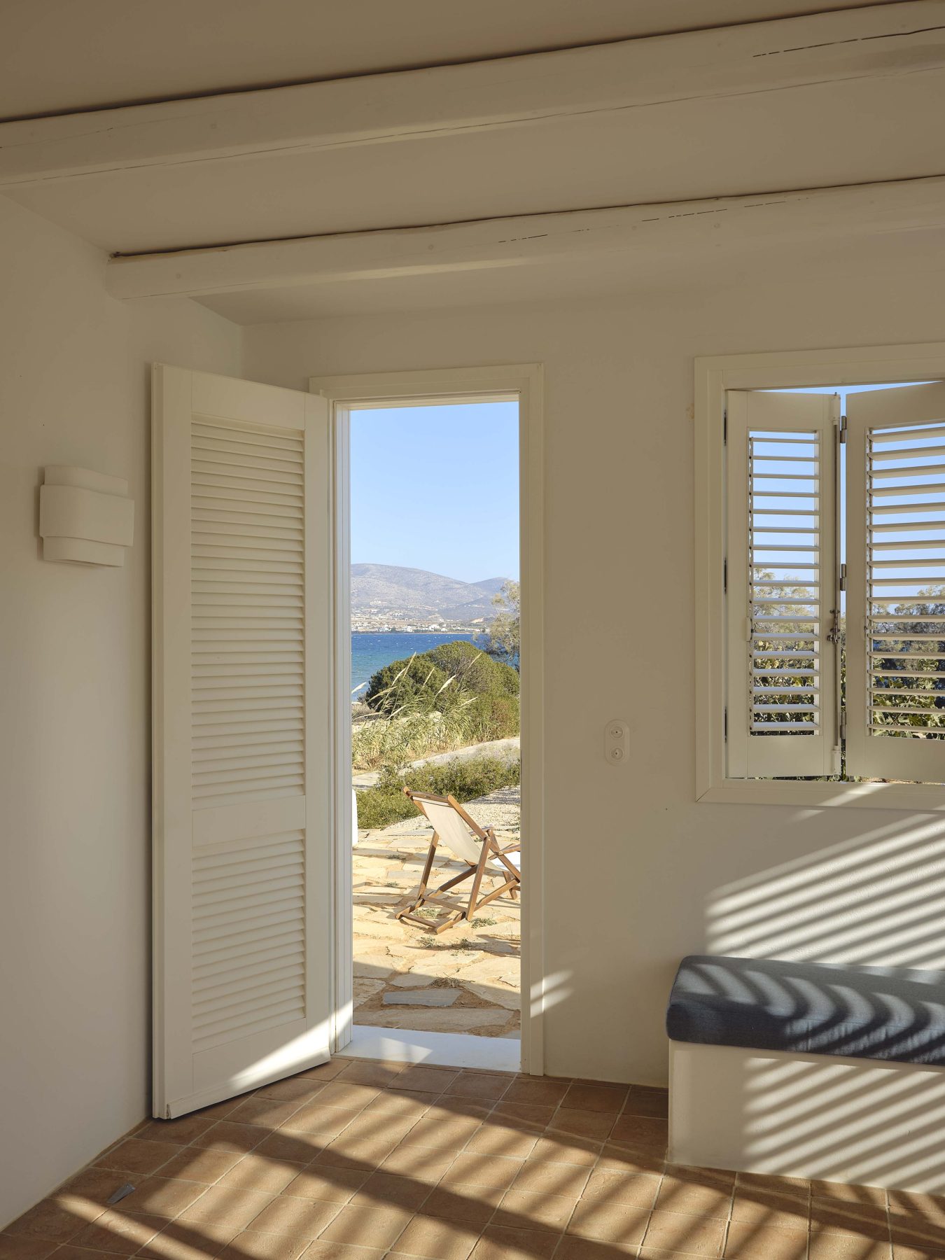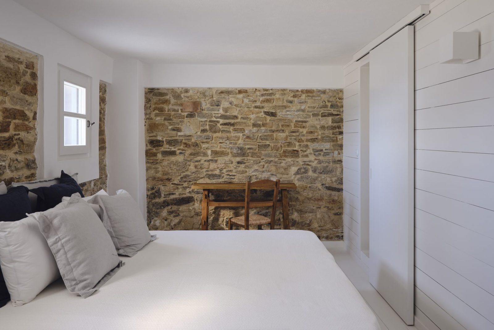 Internally, the project preserves the existing material character while introducing a restrained palette of white-painted solid oak and marble sourced from nearby Naxos.