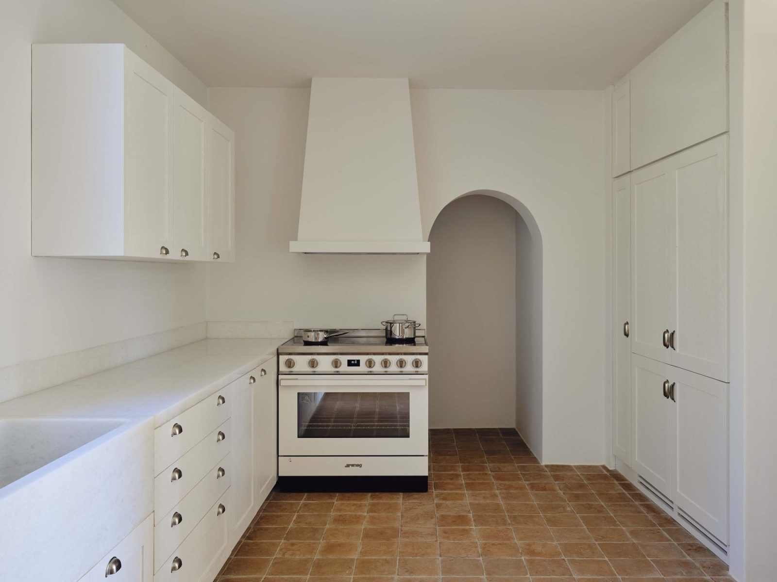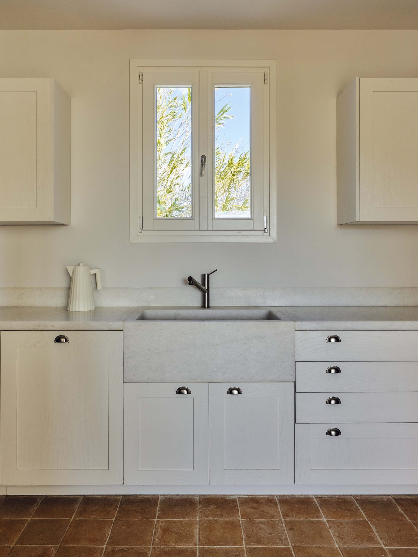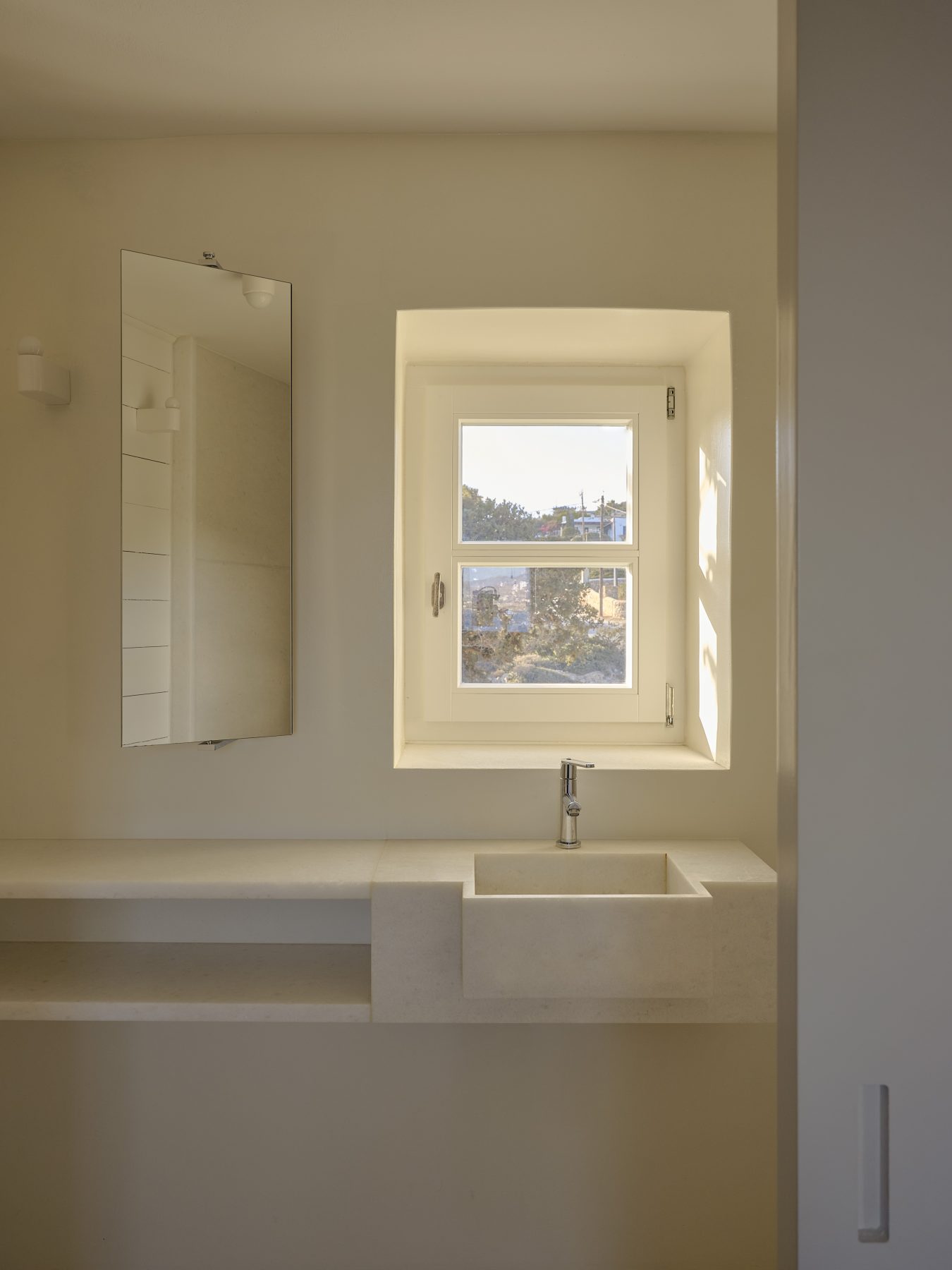 Internally, the project preserves the existing material character while introducing a restrained palette of white-painted solid oak and marble sourced from nearby Naxos.