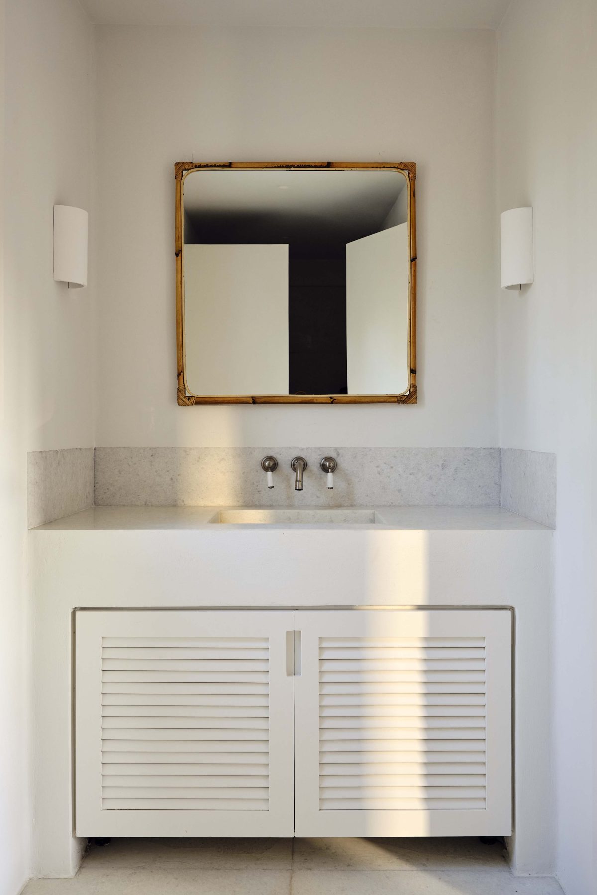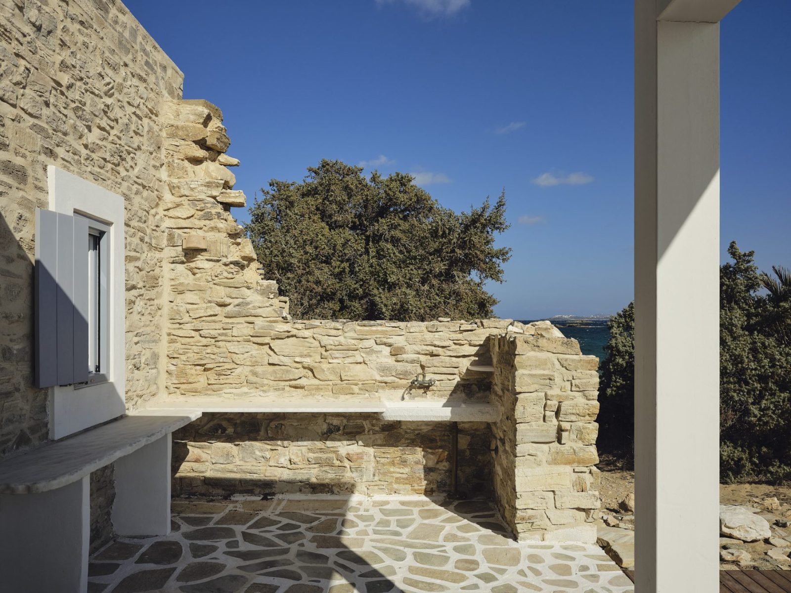 Additions are deliberately minimal, limited to a reclaimed marble sink integrated into the outdoor counter and a custom Dionysos marble table. The shutters are repainted in a light blue tone, subtly reinforcing the building’s relationship to its coastal setting.