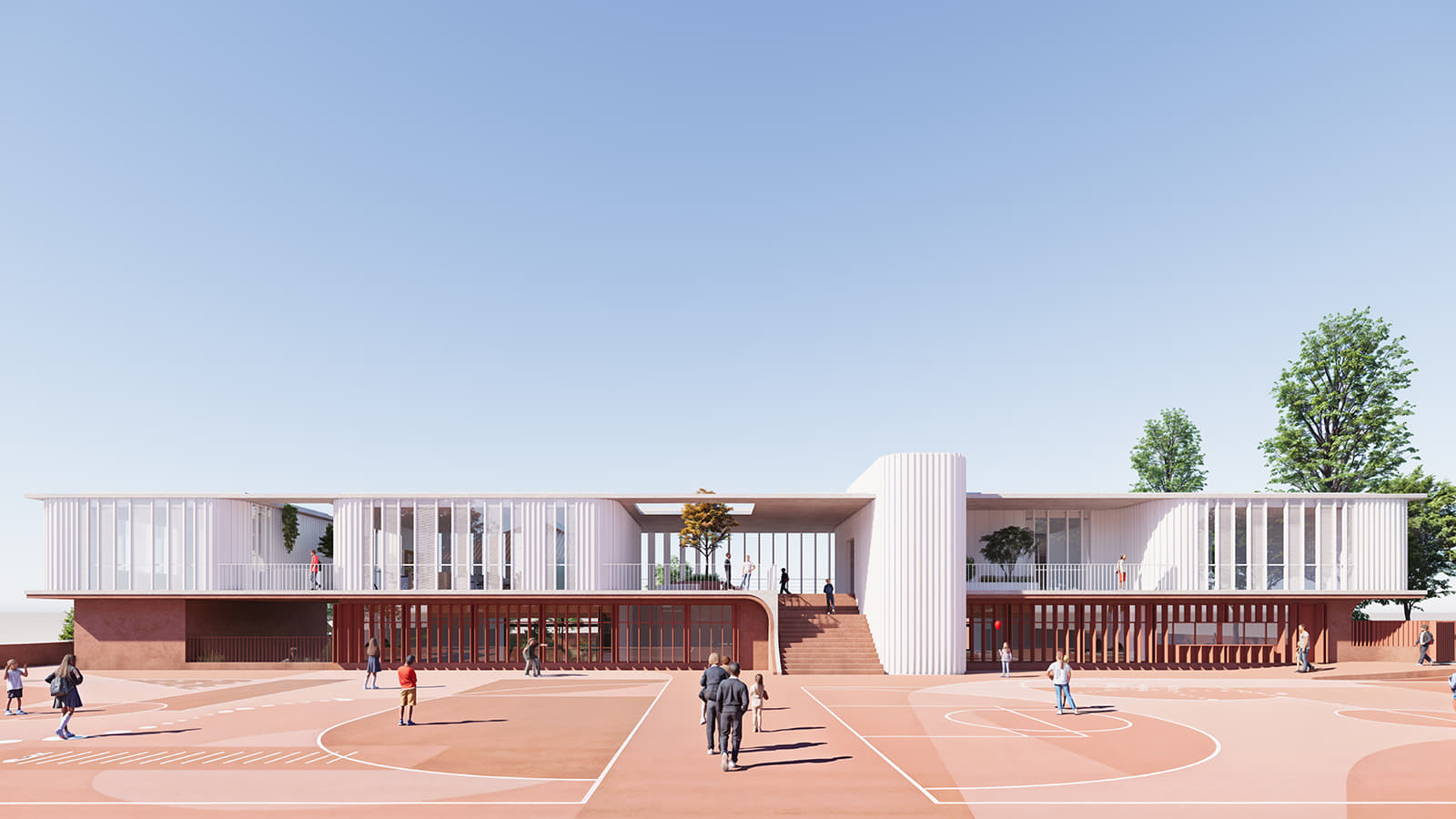 Housing the kindergarten, the lower prism of this two storey assembly is coated in a warm, earthy terracotta hue that operates as a podium for the imposing structure. The latter, contrary to its base is defined by a sinuous white envelope of vertical louvers that create a light, airy volume where indoor and small outdoor spaces intermingle, housing a series of workshop areas for the primary school.