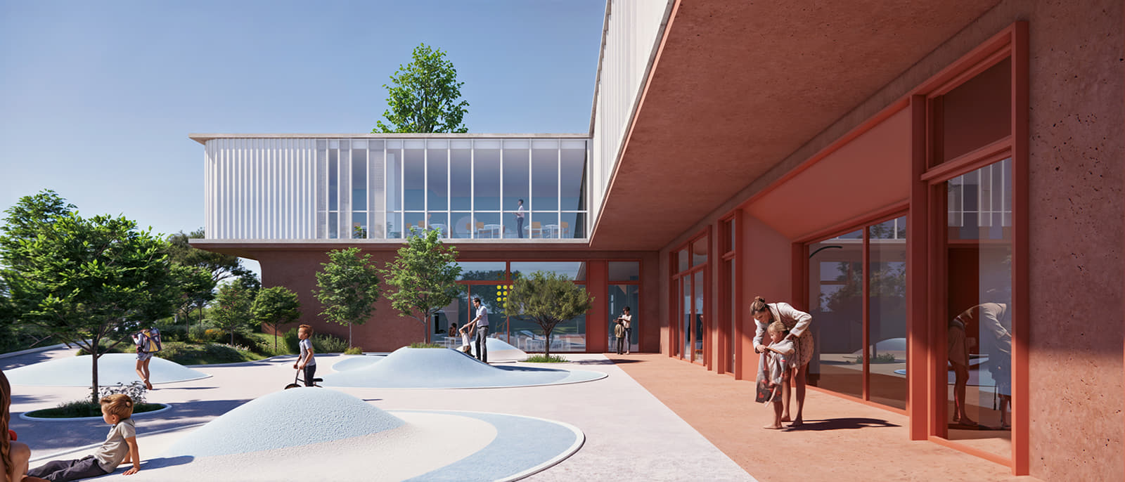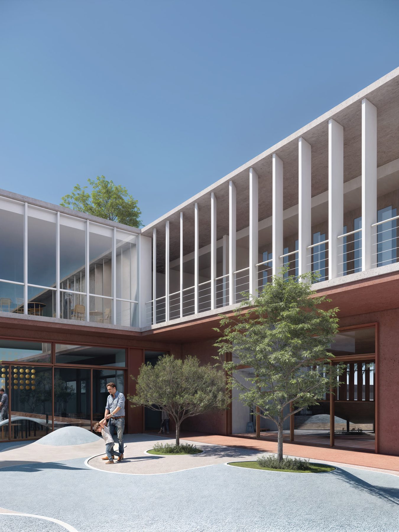 Το υποκείμενο πρίσμα που στεγάζει τις αίθουσες του νηπιαγωγείου, χρωματίζεται με μια έντονη, γήινη απόχρωση που λειτουργεί ως βάση του κτιρίου. Παράλληλα, ο υπερκείμενος όγκος χαρακτηρίζεται από την ελαφρότητα της λευκής, κυματιστής όψης από κατακόρυφες περσίδες. Ένας διαμπερής ημιυπαίθριος χώρος όπου συνυπάρχουν αίθουσες διδασκαλίας, εργαστήρια και μικρές υπαίθριες ζώνες αποτελεί τον νέο πυρήνα που στεγάζει τις δραστηριότητες του δημοτικού σχολείου.
