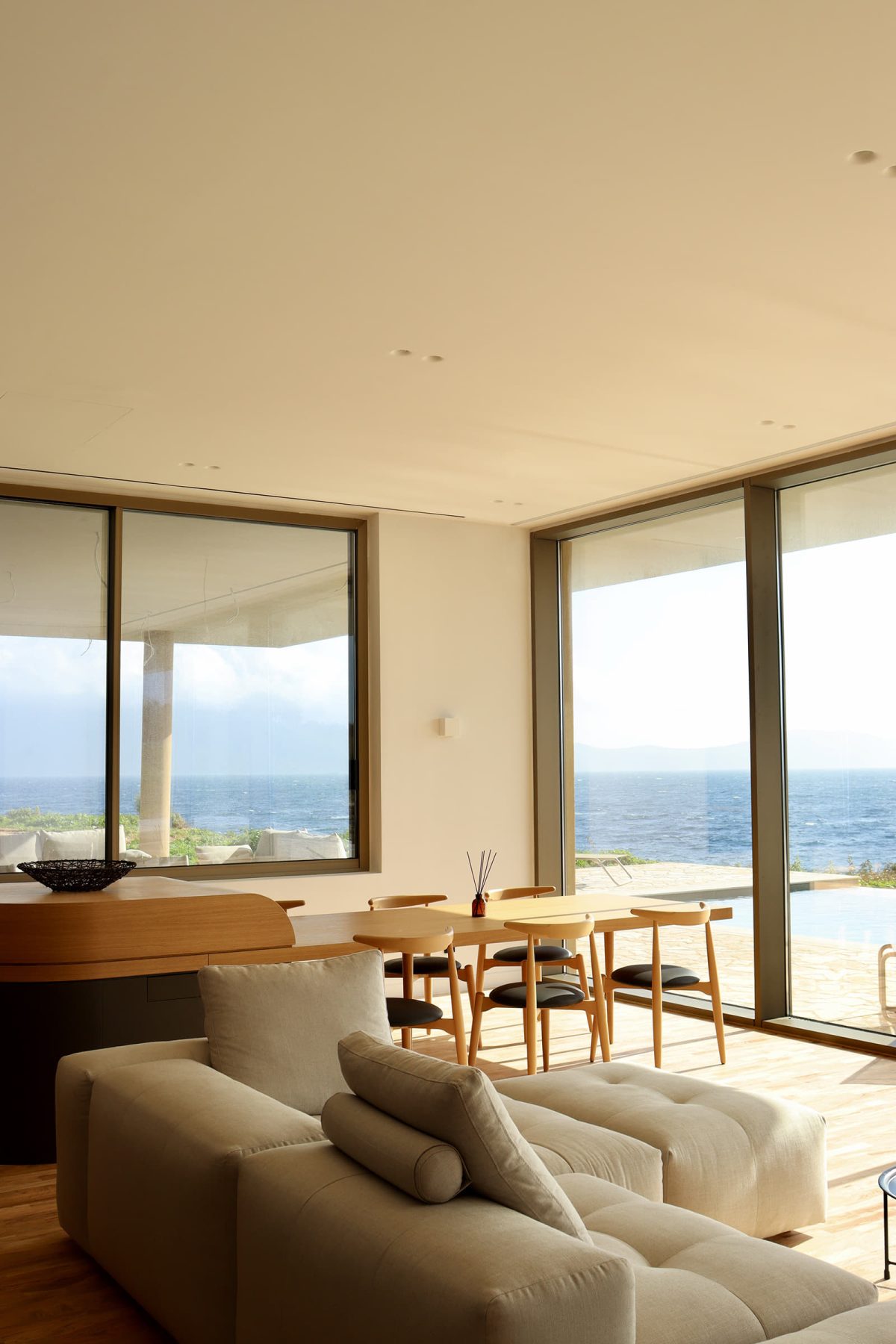 Στο εσωτερικό της κατοικίας, όλοι οι χώροι τοποθετούνται σε παράταξη γραμμικά, λειτουργώντας ως συνεχόμενα κάδρα του πελάγους για τους ενοίκους, όσο αυτοί κινούνται από τους κοινόχρηστους χώρους προς τα υπνοδωμάτια. Ο περιβάλλων χώρος του κτιρίου παραμένει σχεδόν ανέγγιχτος, επιτρέποντας στη χαρακτηριστική φυσική βλάστηση του νησιού να ενσωματώσει πλήρως την κατασκευή στο τοπίο.