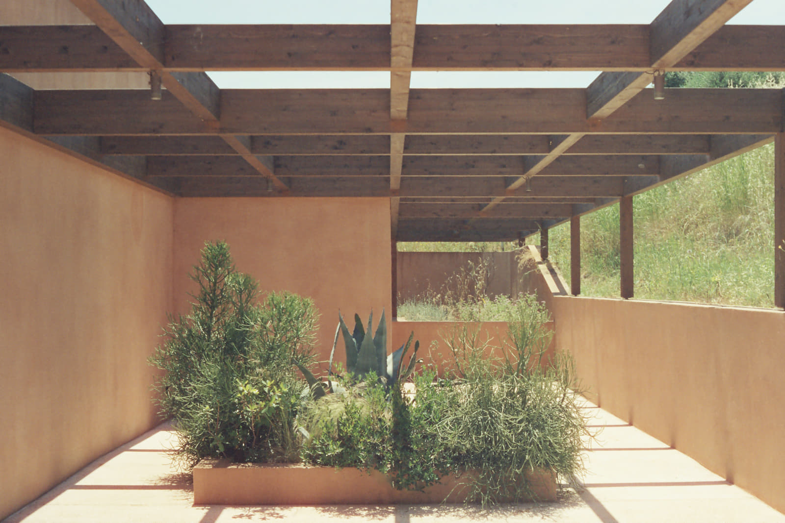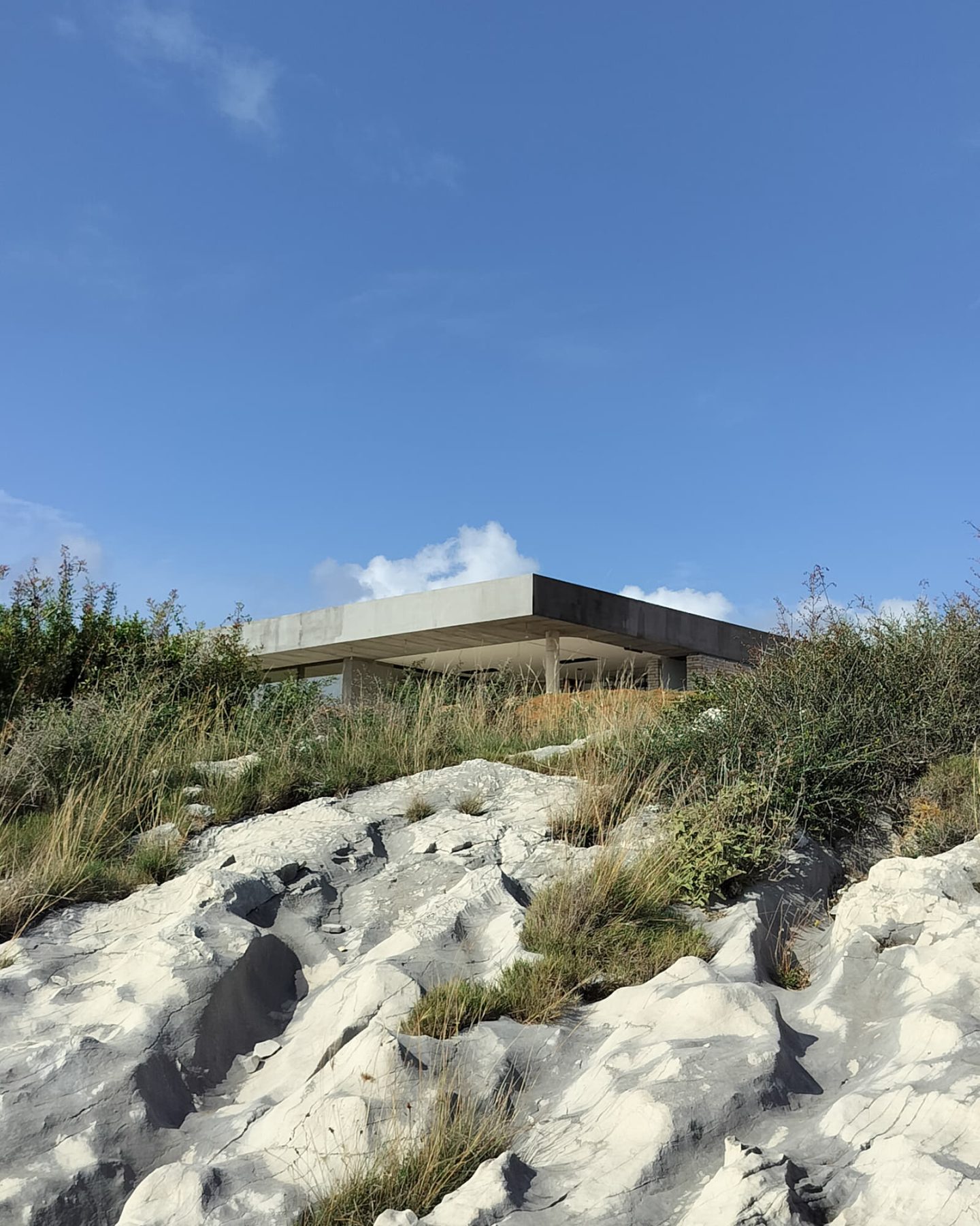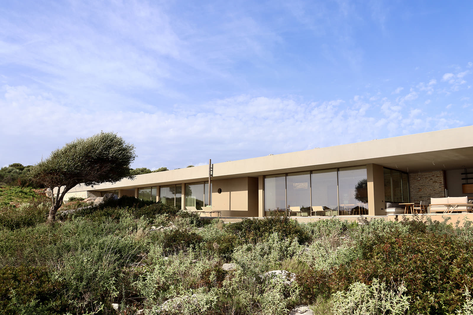 Μία ήπια ανύψωση του φυσικού εδάφους διαμορφώνει μια επιμήκη, σκιασμένη σχισμή και δημιουργεί τους χώρους όπου στεγάζονται όλες σχεδόν οι δραστηριότητες των κατοίκων. Προσανατολισμένη προς τη θάλασσα και καλυμμένη εξ’ ολοκλήρου από φύτευση, η κατοικία καθίσταται ορατή μόνο από τα διερχόμενα σκάφη. Το οπτικό της αποτύπωμα μειώνεται ακόμη περισσότερο χάρη στη χρήση τοπικής πέτρας και γήινων αποχρώσεων, που επιτρέπουν στην κατασκευή να ενσωματώνεται αρμονικά στο φυσικό περιβάλλον.