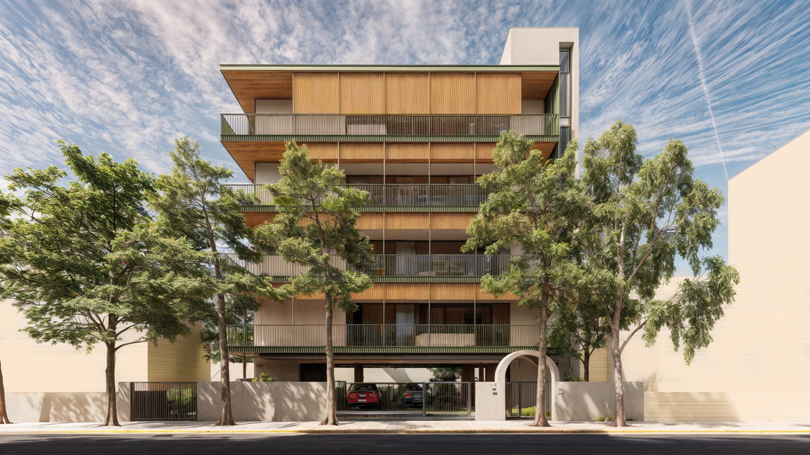 Η προσαρμογή της θέσης του κτιρίου ώστε να διατηρηθούν τα υφιστάμενα ψηλά δένδρα στην περίμετρο του οικοπέδου αποτέλεσε σημαντικό άξονα του σχεδιασμού. Με πρωταρχικό στόχο να αποτελέσει μια διακριτική προσθήκη στην πολυφωνία του αστικού ιστού, η βασική δομή σχεδιάστηκε ως ένας απλός ορθογώνιος όγκος. Τα εκτενή διαμήκη ανοίγματα στη βασική όψη του κτιρίου εξασφαλίζουν άπλετο φυσικό φως και οπτική συνέχεια από τους κοινόχρηστους χώρους προς τους επιμήκεις εξώστες, ενισχύοντας τη σύνδεση εσωτερικού-εξωτερικού χώρου σε κάθε διαμέρισμα.