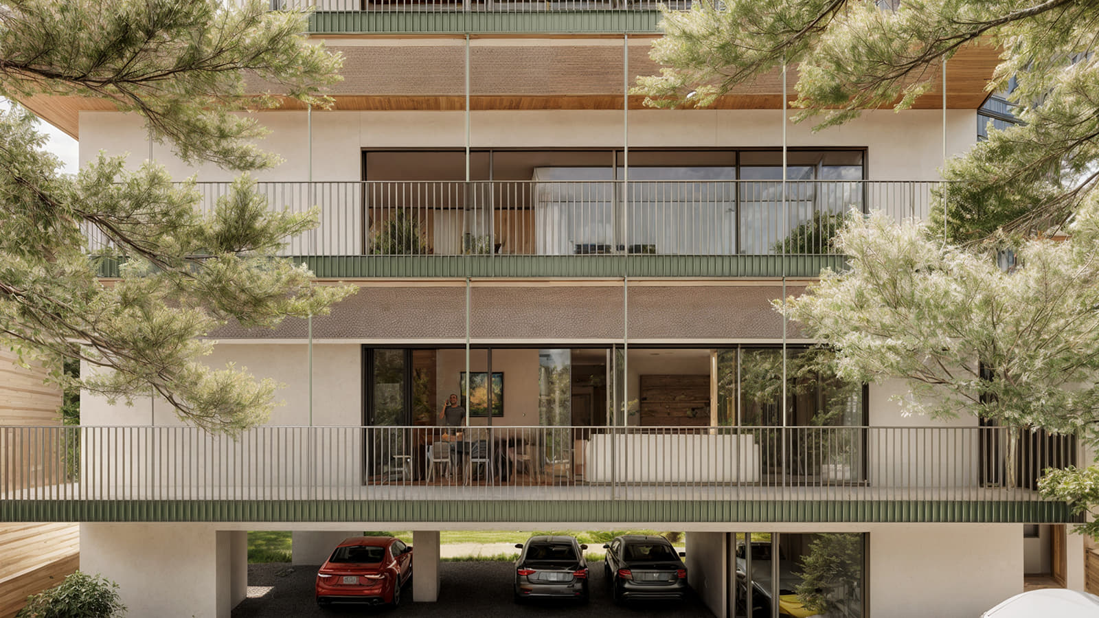 Aiming to provide a humble addition to the polyphony of the urban fabric and to preserve the existing tall trees on the perimeter of the plot, the main structure is conceived as a simple rectangular mass. Large window frames provide ample light and continuity from the communal areas to the elongated balconies enhancing the sense of airiness of each apartment.