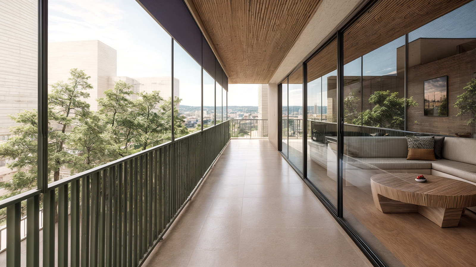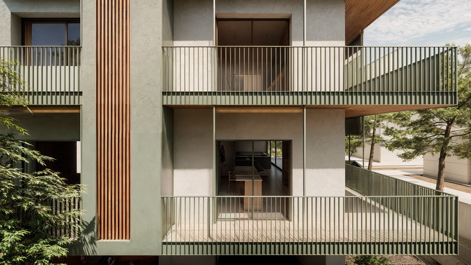 Although the main block is painted in a typical off-white color, the protruding balconies are adorned with natural hues and colors, olive green railings, wooden ceilings, and terracotta awnings in order to blend with the surrounding nature.
