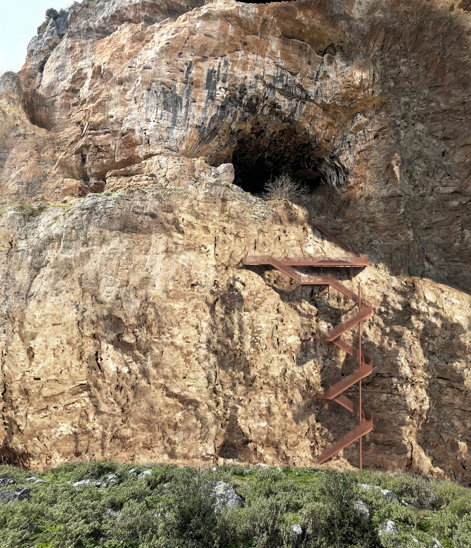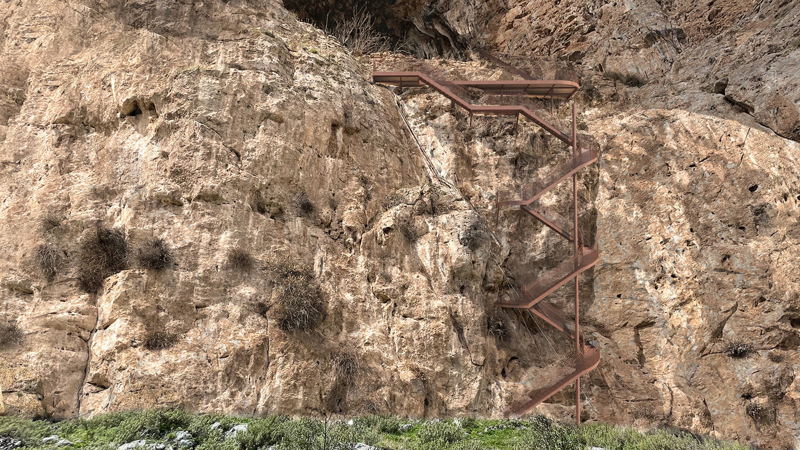 Σκοπό της παρούσας μελέτης αποτελεί η διασφάλιση των συνθηκών πρόσβασης για τους επισκέπτες, με σεβασμό στο περιβάλλον επέμβασης. Η ανάβαση επιτυγχάνεται με το σχεδιασμό μίας ελικοειδούς κλίμακας. Η ηπιότητα και η αναστρεψιμότητα της προτεινόμενης παρέμβασης με το ελάχιστο δυνατό αποτύπωμα, καθώς και η πλήρης εναρμόνισή της στο φυσικό τοπίο, αποτελούν τις βασικότερες προκλήσεις που καλείται να ικανοποιήσει η αρχιτεκτονική πρόταση.