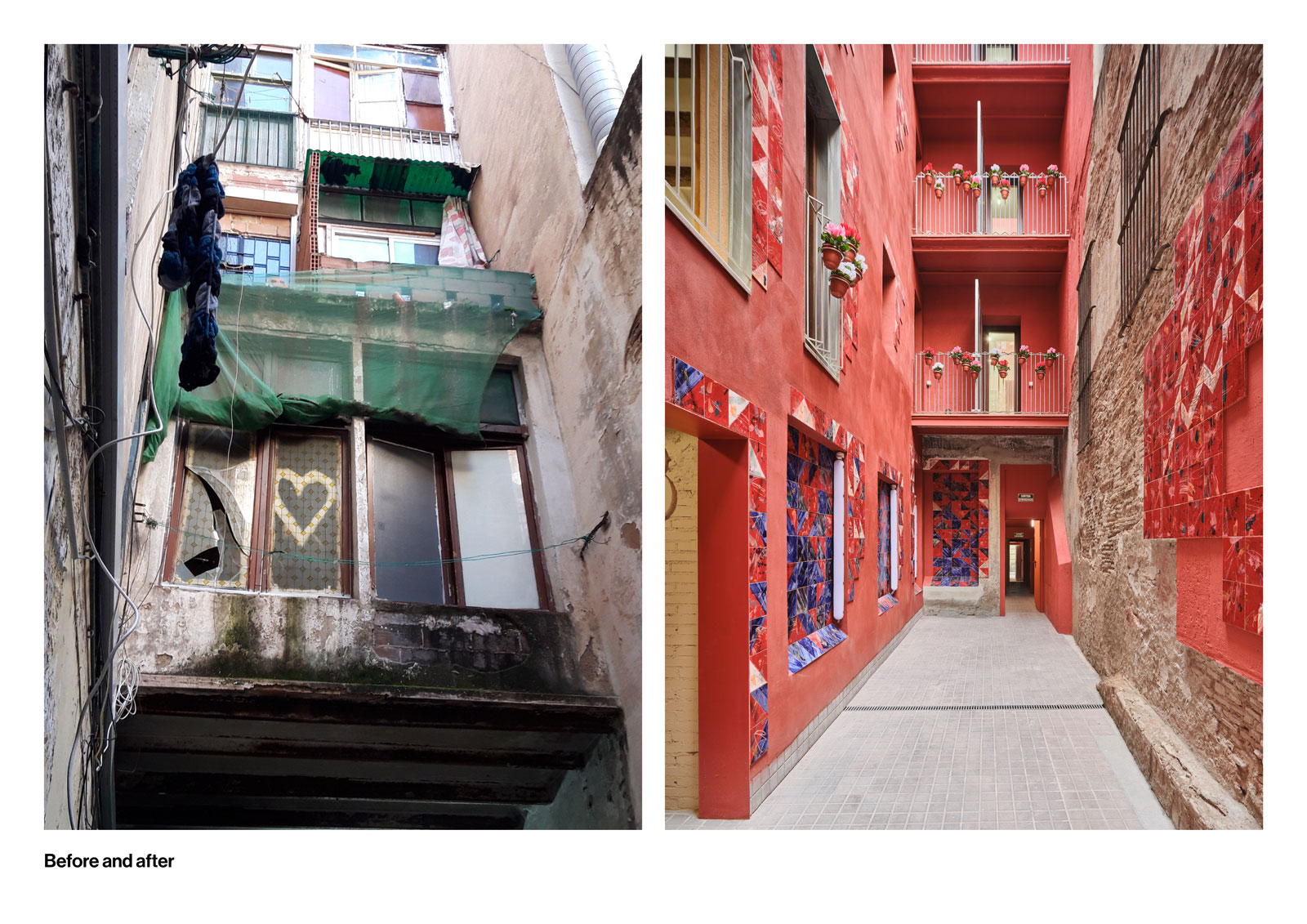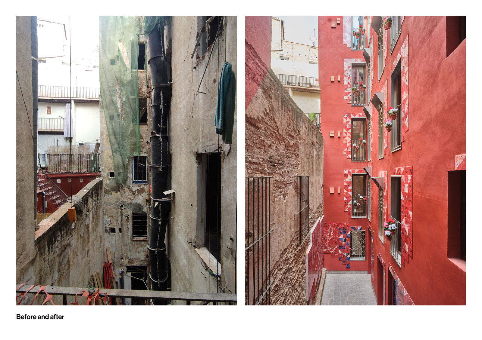 In previous decades, the neighbourhood carried a reputation shaped by informal activities. The building subject to this rehabilitation project had also been marked by these conditions, with several of its micro-apartments informally adapted for such uses. Many of its previous occupants were of foreign origin, reflecting the broader multicultural profile of the area. The original building, fronting Hospital Street, featured a dedicated entrance accessing several floors and a ground-floor commercial unit. A second L-shaped volume had been added later, wrapping around a central courtyard and enclosing it.