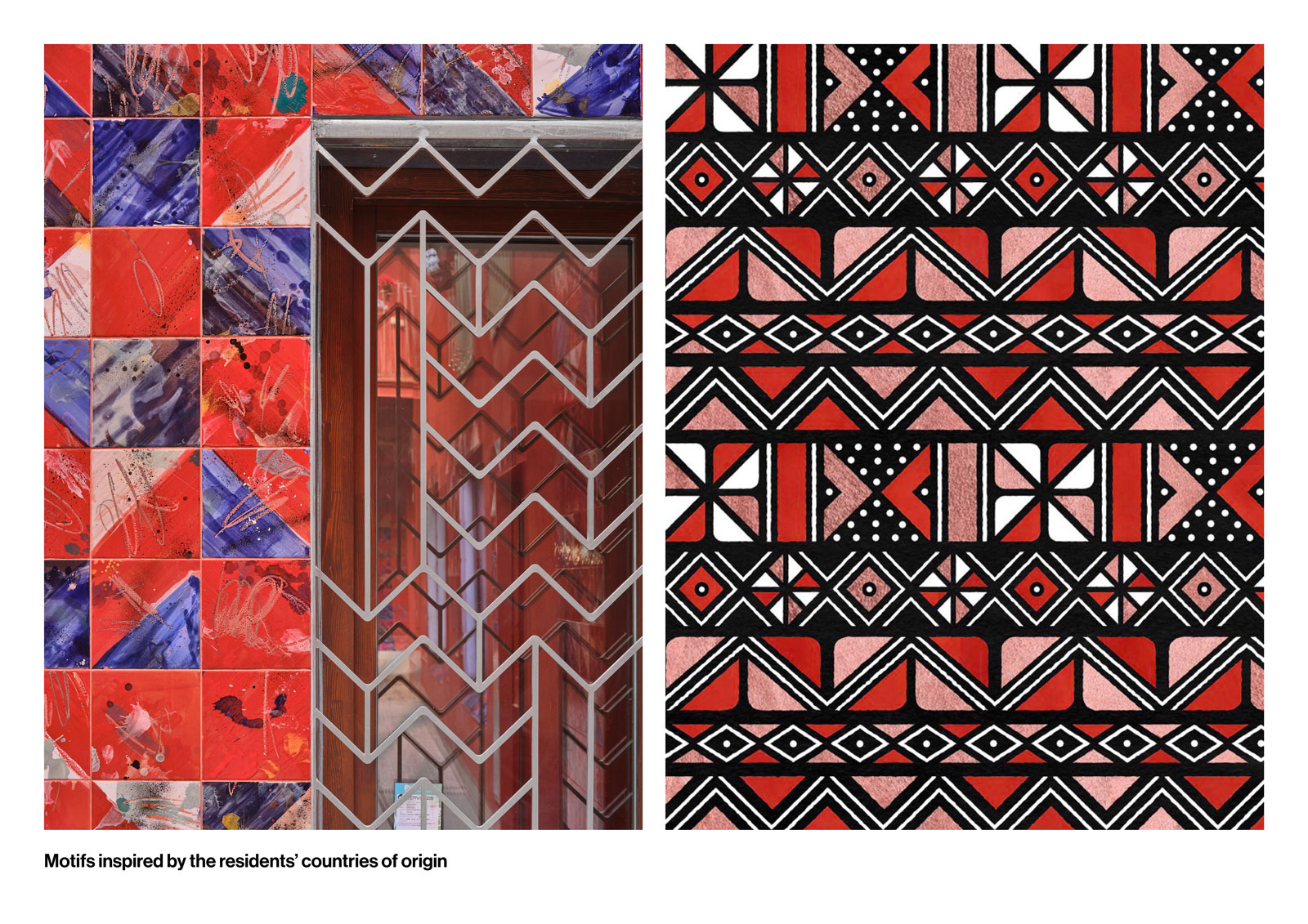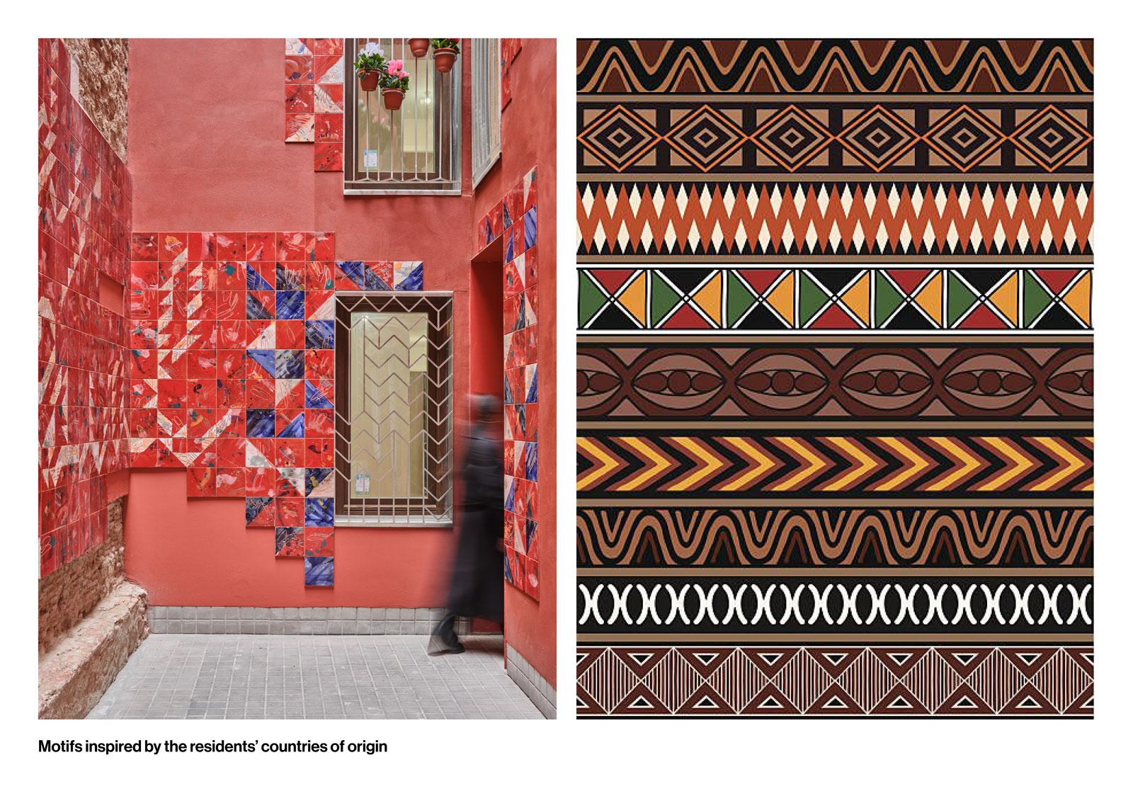 The design treats this courtyard as a canvas for expressing the identity, personality, and multicultural nature of the residents who will return to the building after its rehabilitation. Through references to the domestic and everyday—items such as textiles, ceramics, tools, and food—the space seeks to honour the heritage of the community. Graphic motifs, patterns, and colours are employed as expressions of cultural identity.
