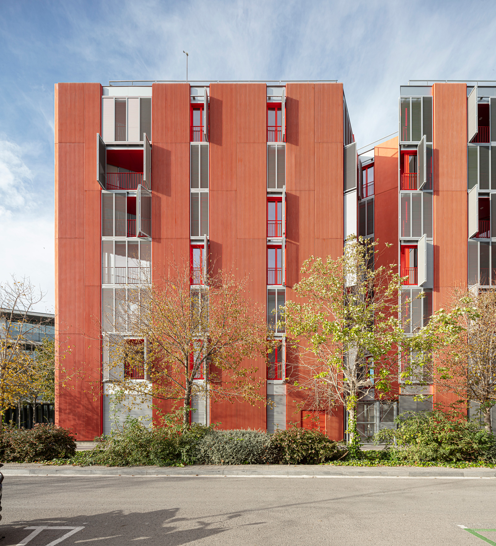 La Marina del Prat Vermell is an old district of textile colonies established in the mid- nineteenth century south of Montjuïc in Barcelona, near the sea. Fabrics were dyed and dried on the meadows, giving the area its name: “Marina del Prat Vermell”, meaning “the Red Meadow Marina.” The project occupies a triangular plot formed by the streets Ulldecona, Cal Cisó and Pontils.