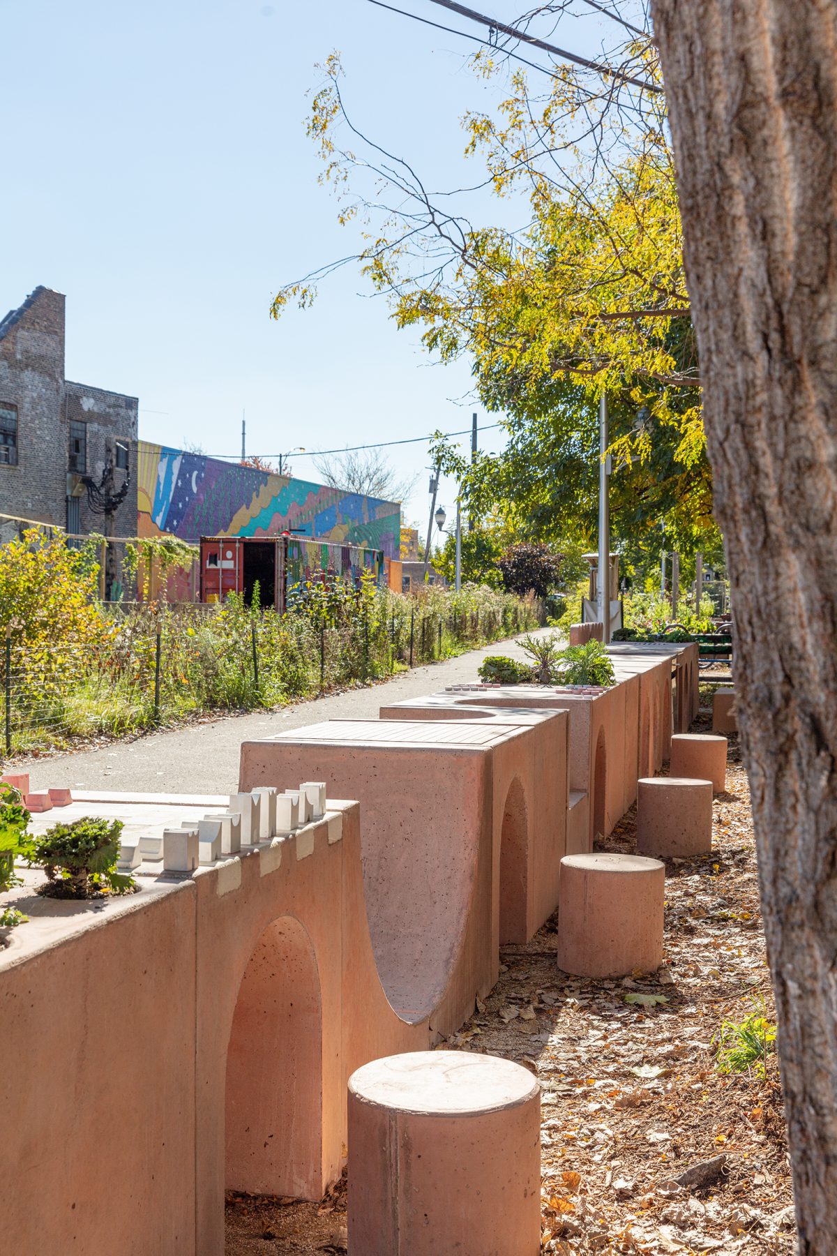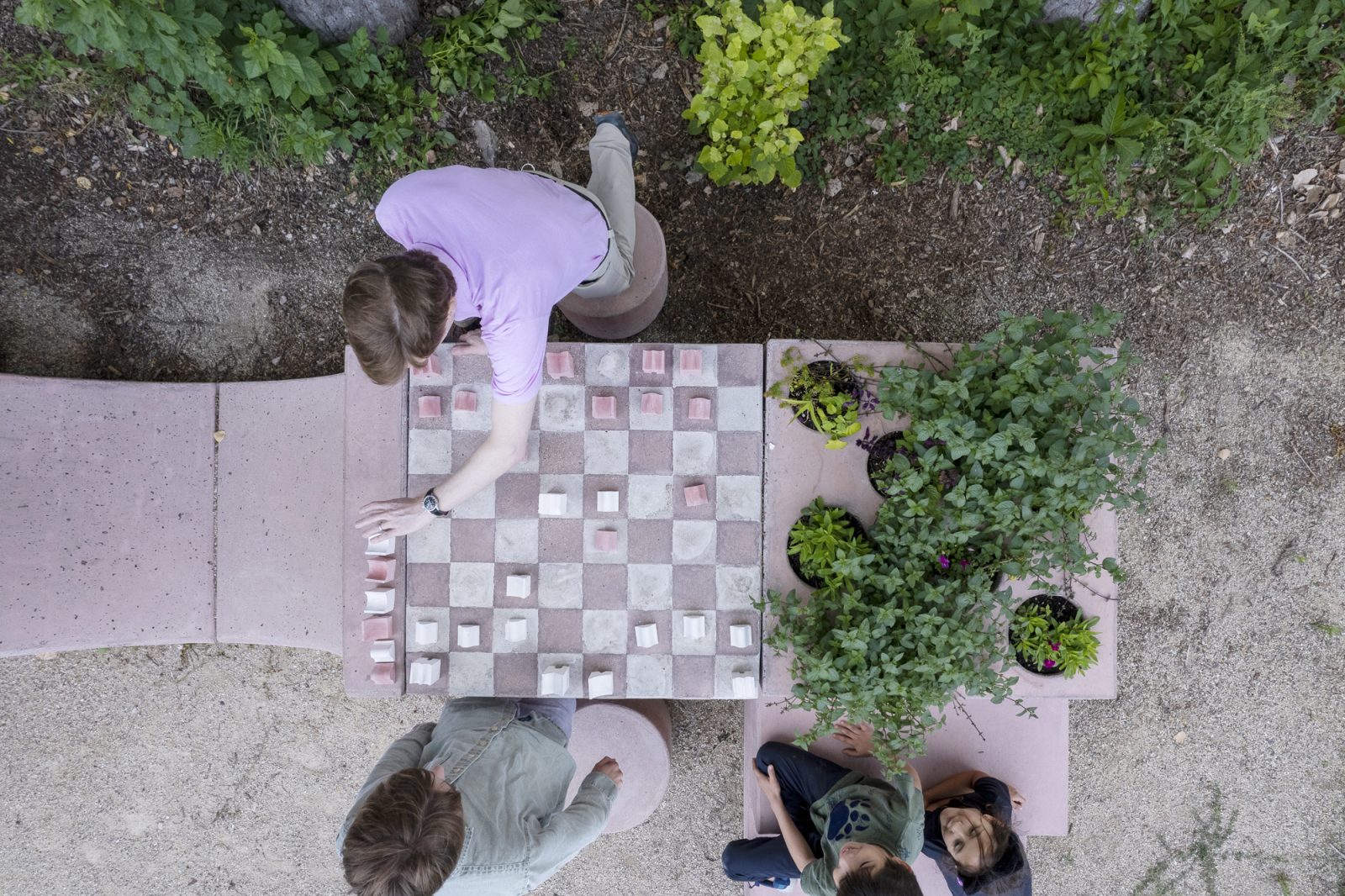 Embedded within the material composition are references to its immediate context, incorporating stones from Lake Michigan, garden soil and found objects, as well as cultivated and spontaneous plants that blur the boundary between furniture and landscape. Fire pits, spice niches, built-in vases for herbs and terrazzo game surfaces—featuring chess, backgammon, Go and checkers—extend the table’s affordances, allowing different actions to coexist, overlap or subvert one another.