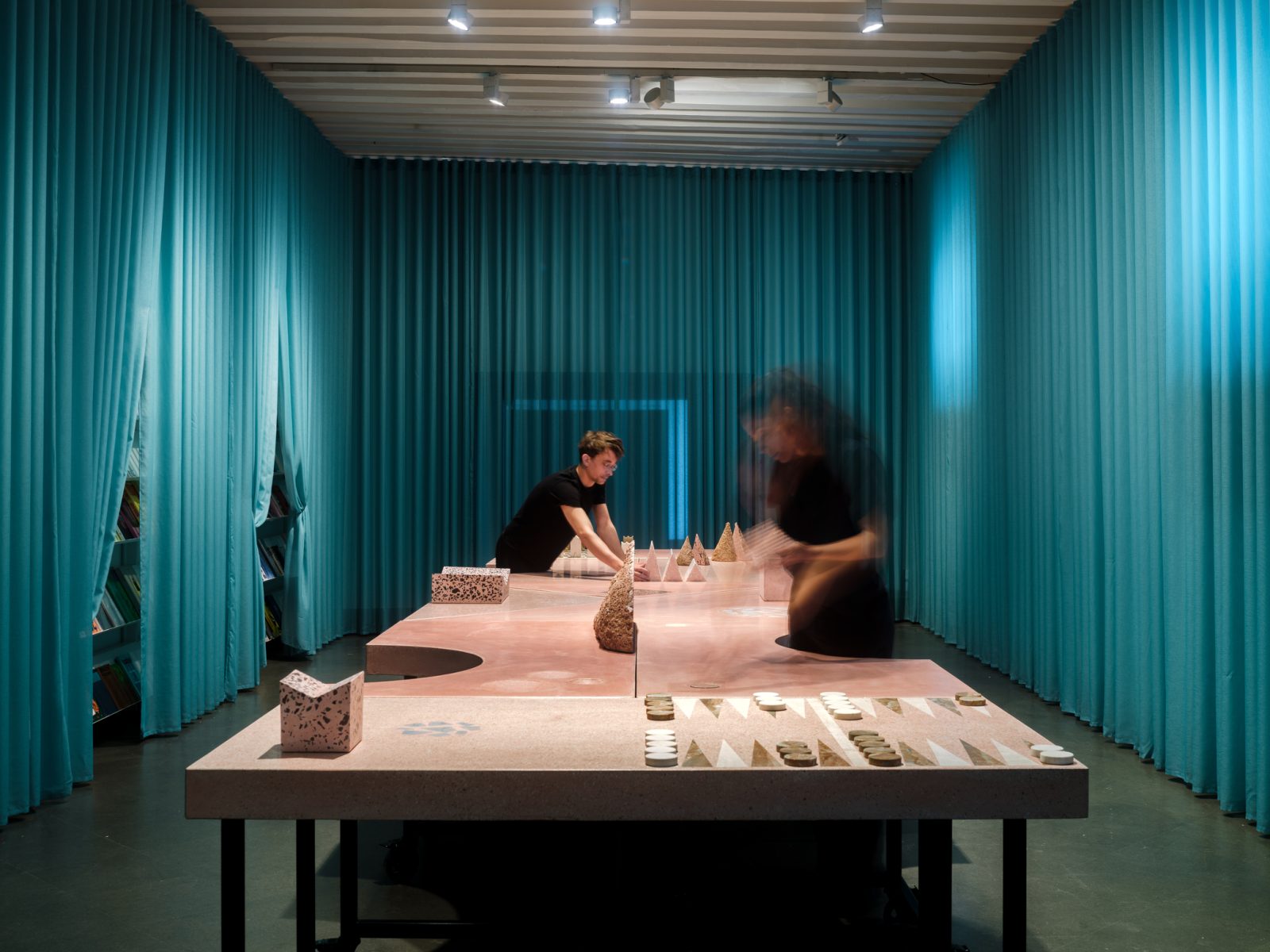 Part kitchen, part game board and part stage, the installation takes the form of a modular cast object designed to be touched, used and cultivated over time, encouraging visitors and neighbours to engage with it through informal and performative acts.
