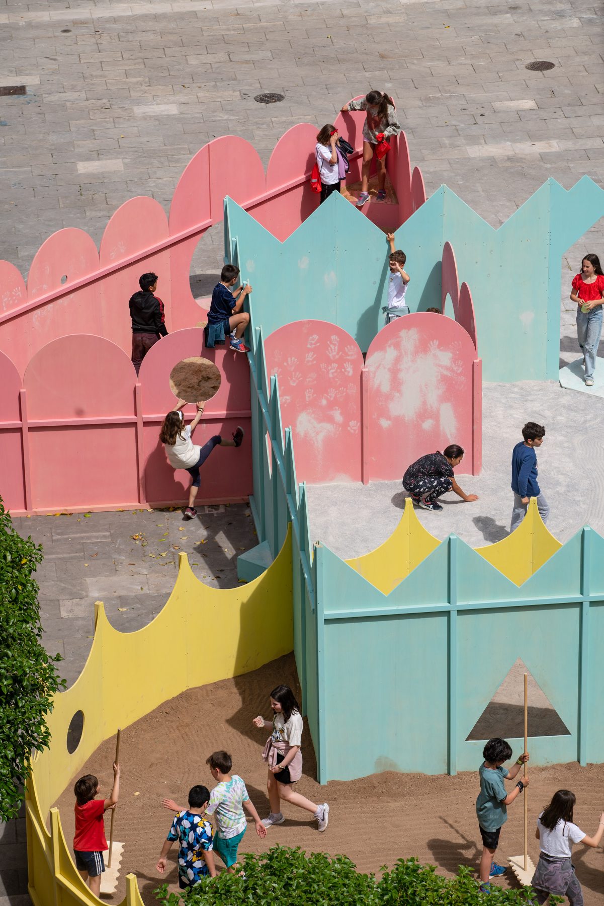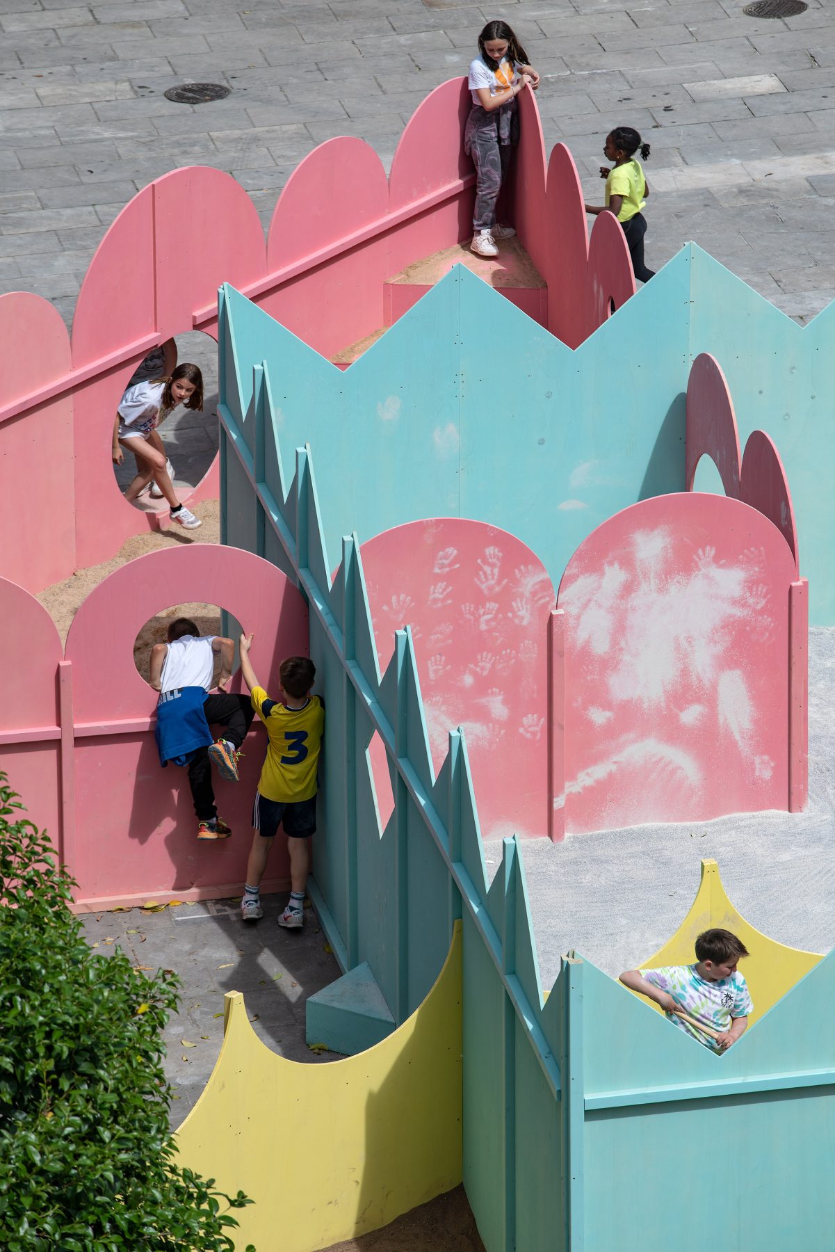 Rather than conceiving space as a fixed form, the studio approaches each project as a dynamic entity capable of transformation over time, encouraging reconfiguration, participation and reinterpretation by users. Their installations often function as modular landscapes or shifting surfaces that invite play, gathering and informal occupation, dissolving hierarchies between spectator and actor.