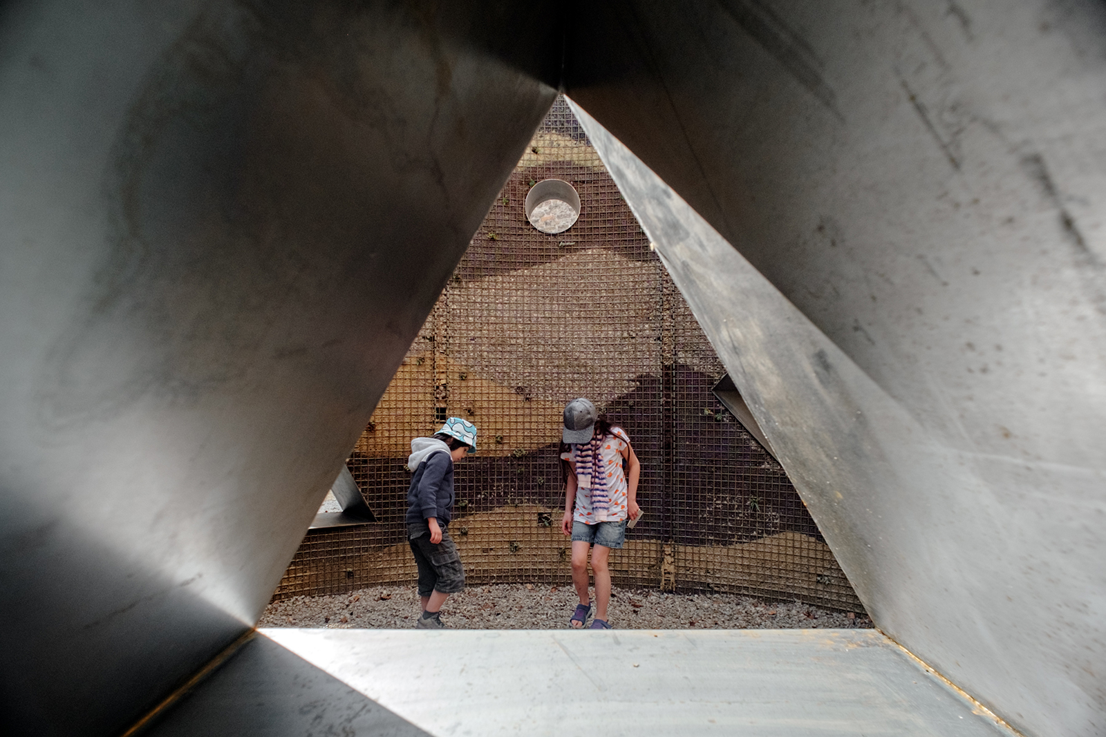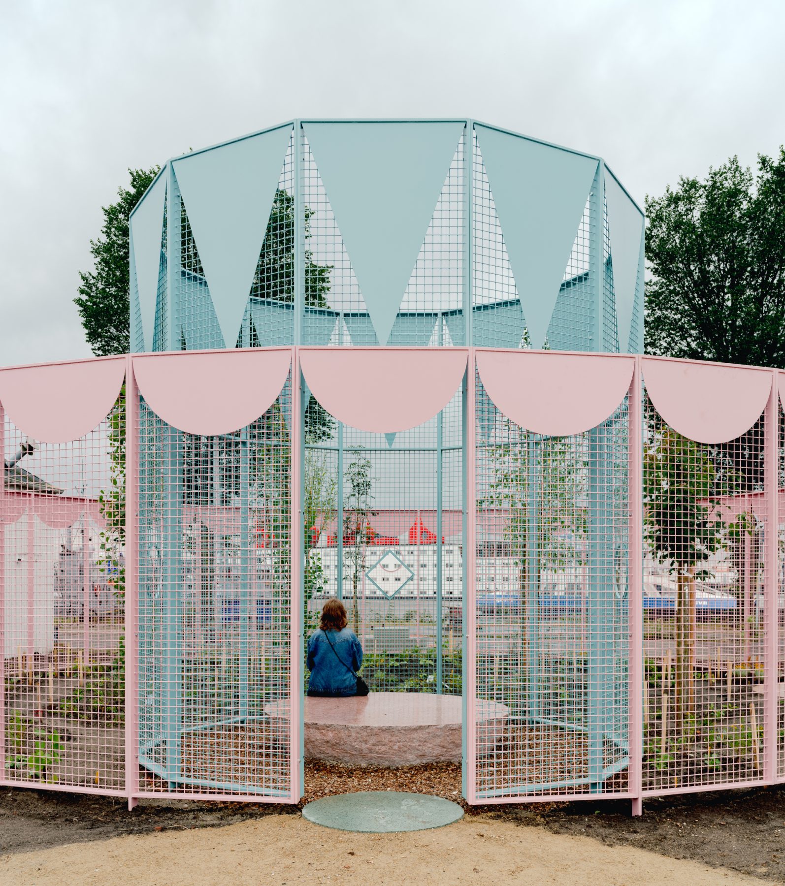 Composed of a metal grid filled with earth, peat, shells and leaves, the pavilion is stratified like a stack of ecosystems, inviting close observation and tactile engagement.