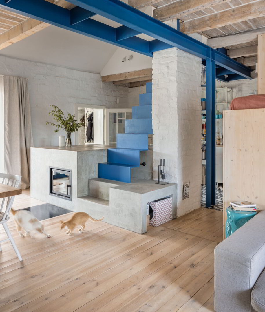 In Olivier in Athens, Ak-a Apostolou Colakis Architects reinterpret a characteristically brutalist duplex through a nuanced interplay of material honesty and chromatic intervention. While exposed concrete, hardwood floors, and metallic elements preserve the raw geometry of the existing structure, colour emerges as a formative architectural device that reshapes atmosphere and use. Petrol blue metalwork, applied to railings, bookshelves, and the floating staircase, acts as a spatial anchor, unifying the two floors and introducing warmth and playfulness into the industrial framework. Enhanced by mirrored surfaces that amplify light and movement, colour becomes structure here, transforming the apartment into a multifunctional, family-oriented home where atmosphere is carefully constructed rather than merely decorated.