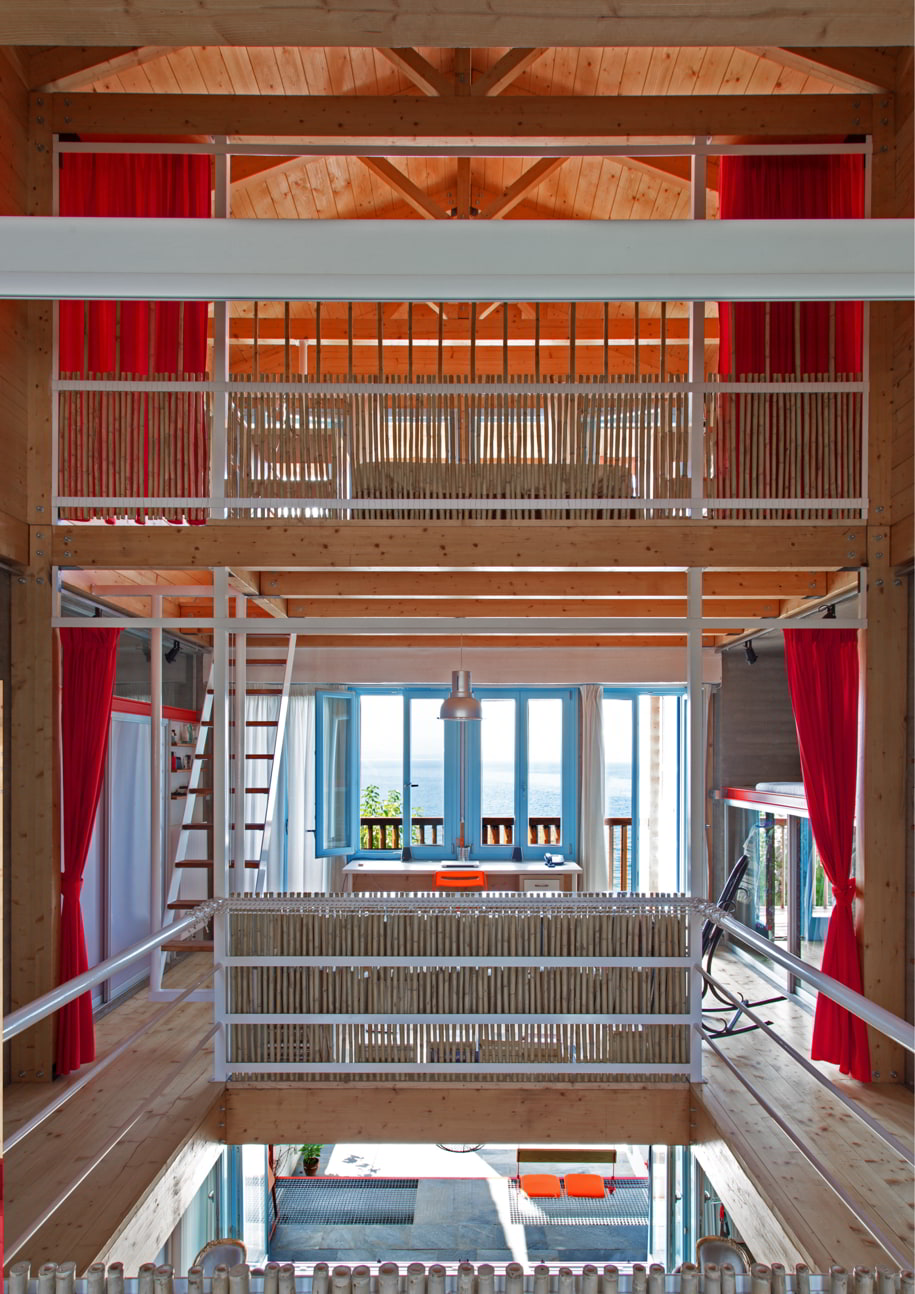 “Monochord”, by Zissis Kotionis is a vessel with a “maximum loading capacity” of six persons. It can host them in many different programs and living attitudes. Being designed as a pattern- house, its typology is based on a three partition basilica type. The two parts on the sides, performing as utilitarian spaces, support the use of the main space, in three levels. Support and supported spaces interact as a living theater, transparent on the axis from the mountain (North), to the sea (South). Open to an understanding of “world architecture”, the design approach can be considered as an ethnographic recomposition with modern syntax. The question both for the architectural object and the living subject is: How to identify through otherness.