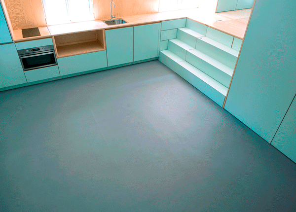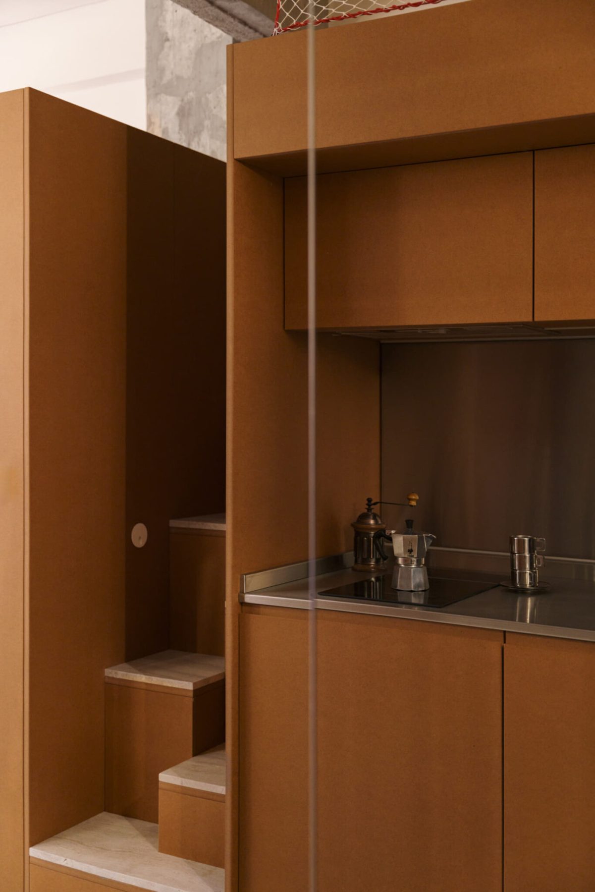 The Violetta Apartment is a complete renovation of a 25 m² first-floor flat defined by a carefully designed, mono-material furniture element that organizes the entire space. Through minimal yet precise interventions, threshold team creates a sense of home within restrained conditions. Every element is multifunctional—the corridor becomes the kitchen, storage integrates into surfaces, and the sleeping area occupies the space above the cooking zone—allowing the apartment to feel larger than its footprint.
