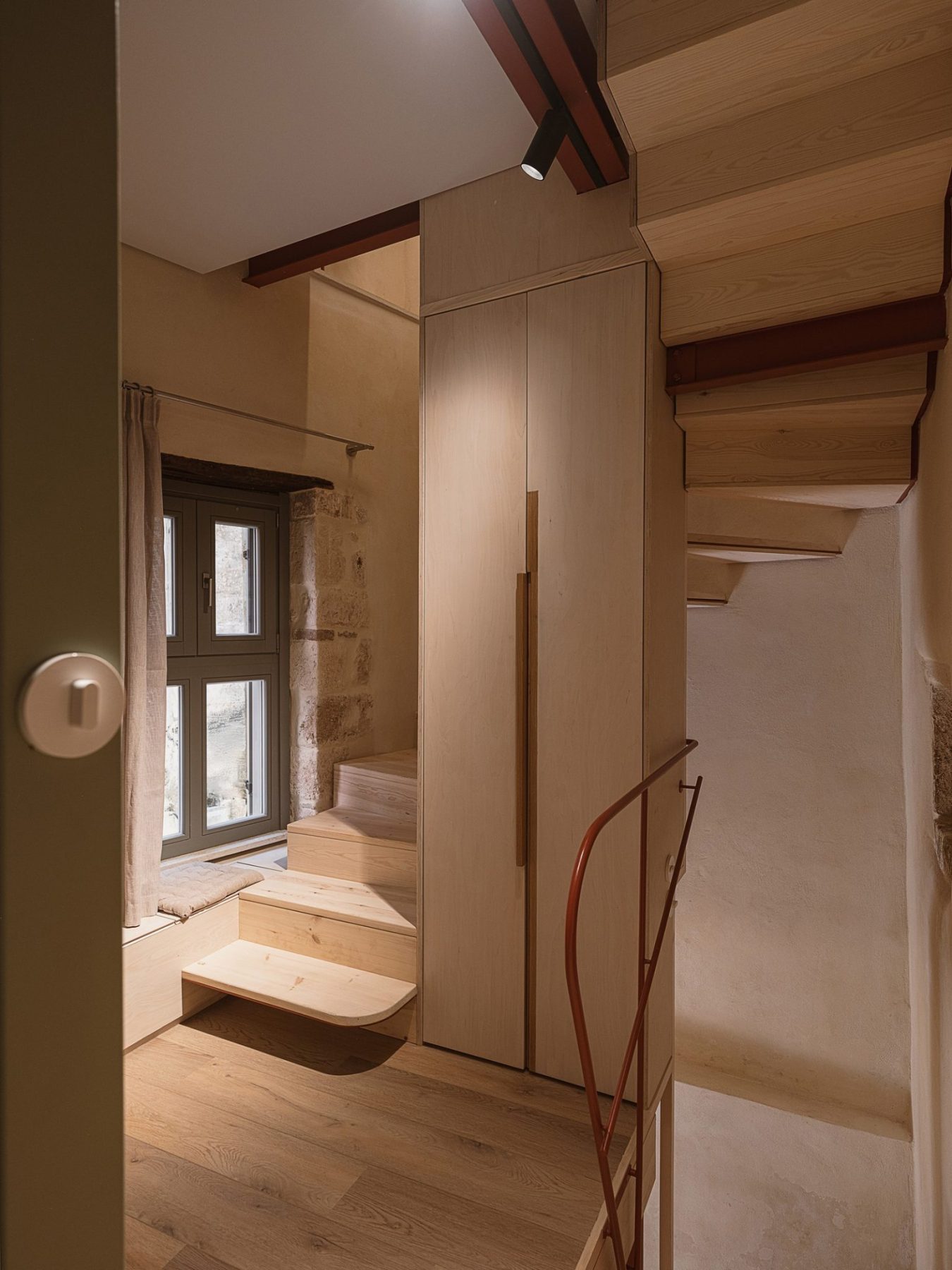 This 35.00 m² renovation of a three-storey Venetian building in the Old Town of Chania reimagines domestic comfort within an exceptionally constrained interior. The design strategy minimizes intervention in the existing shell, carefully preserving the original wooden mezzanine floors and roof structure, while introducing new living spaces that balance spatial efficiency with material continuity.