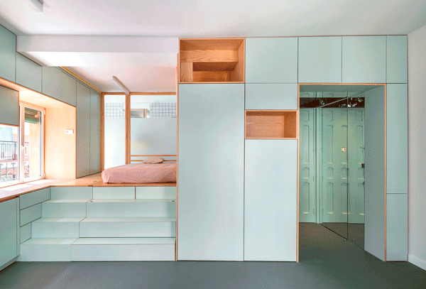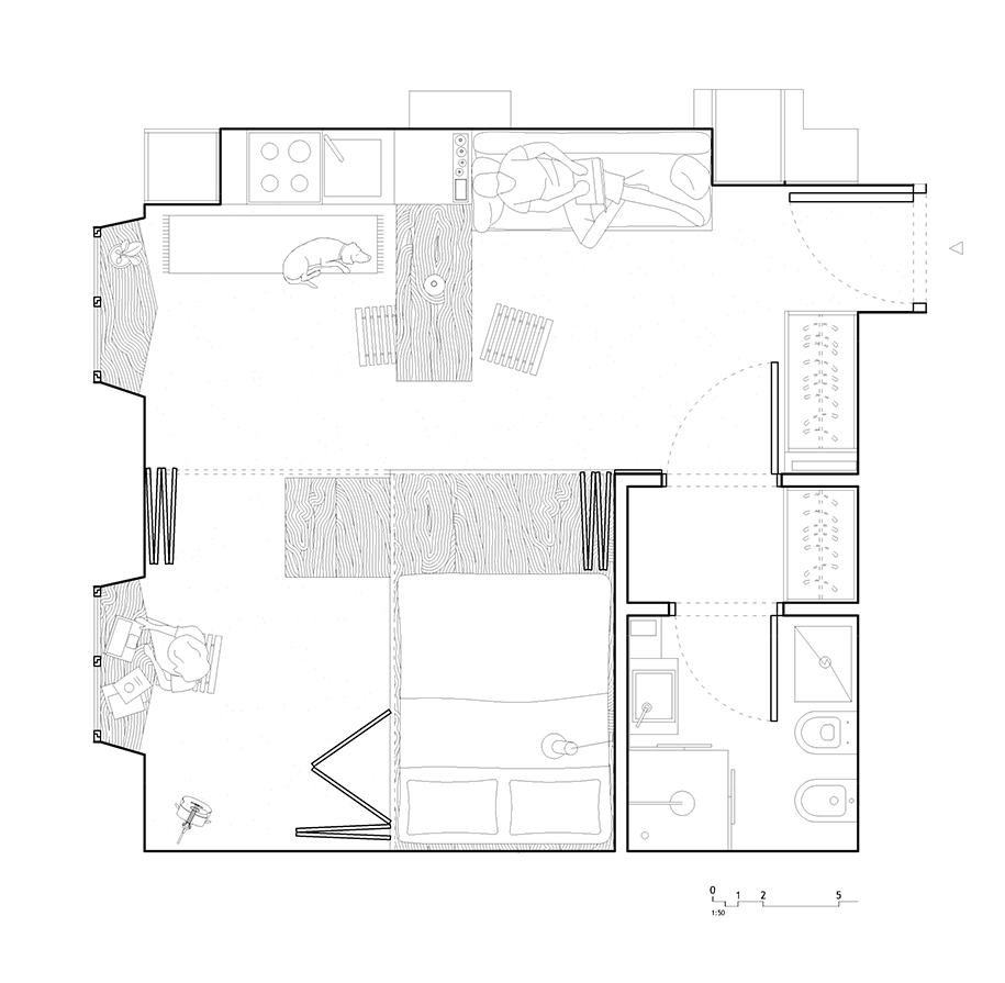 A 47 m² apartment in Madrid, renovated by GON Architects, translates the philosophy of il dolce far niente into spatial form. By removing internal partitions and introducing continuous perimeter storage, the design ensures light, ventilation, and flexibility. This strategy liberates the center into a multifunctional 7 × 2.5 m room connected to a south-west terrace, where cooking, working, resting, and sleeping unfold—favoring a contemplative, unprogrammed domestic life.