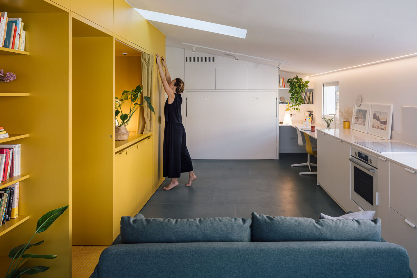 Locally known as δώμα, small rooftop flats are a defining feature of the Athenian urban landscape. Architect Federica Scalise renovated a compact 23 m² rooftop dwelling on the coast of Alimos, pursuing maximum spatial optimization through multifunctional, custom-designed furniture while carefully restoring the apartment’s original architectural features.