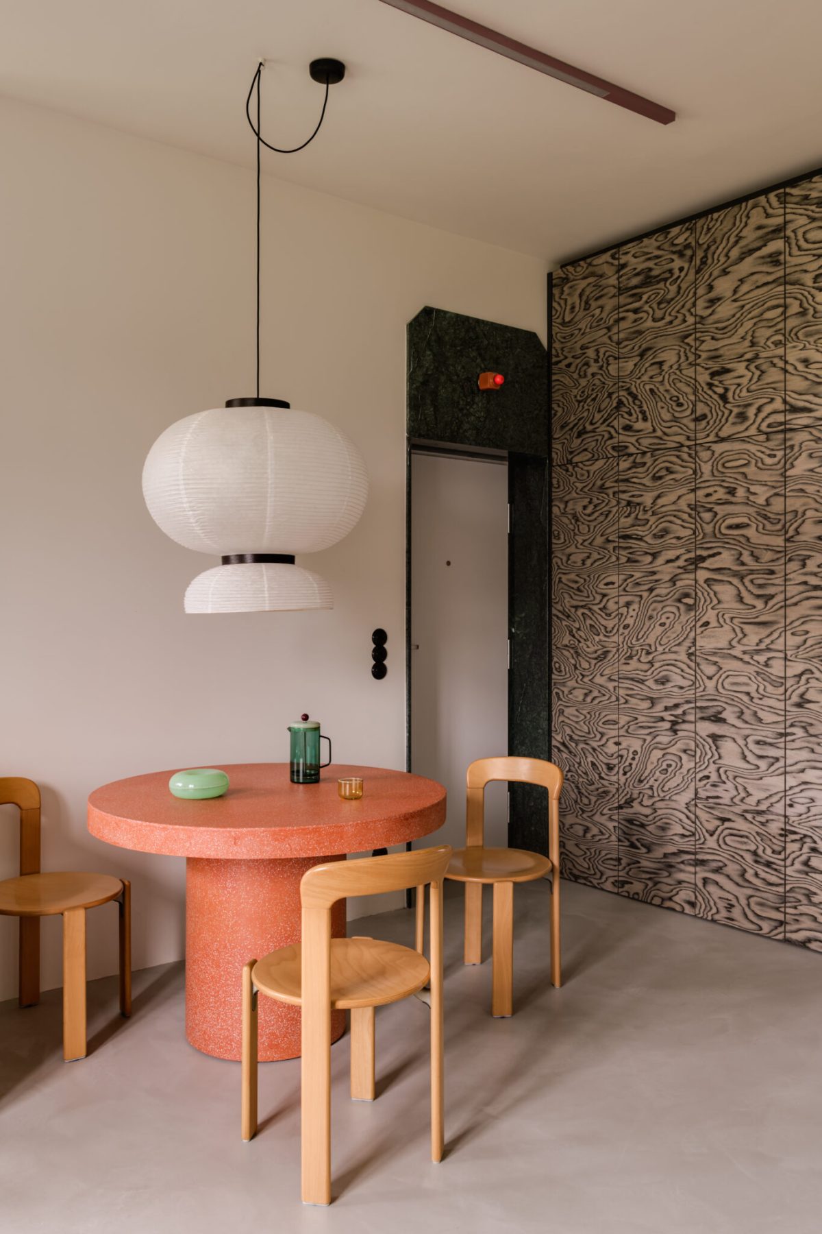 Within a listed residential complex of 1950s Soviet-era architecture in Warsaw, Poland, a diminutive 45 m² apartment rejects the modernist austerity of Less is More in favor of the exuberant pluralism of postmodern fantasy—where Less is a Bore. Radically personal and bordering on eclecticism, the new design weaves together bold and unexpected combinations of color and material, psychedelic patterns, and classical references into a continuous mosaic of domestic life. Conceived by Marcin Czopek of Mistovia Studio, the interior juxtaposes vintage furnishings and design classics—such as Bruno Rey’s iconic Rey Chair, the most widely produced Swiss chair of all time—with contemporary objects by emerging Polish studios, alongside bespoke fixed and movable furniture. The result is a richly layered interior that celebrates individuality, narrative, and spatial exuberance.