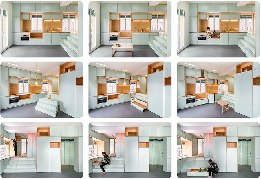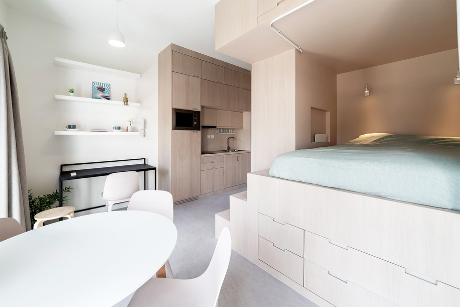 SAP Microapartments, by Barespace, transform a series of former office and industrial buildings into compact residential units. Commissioned to adapt properties that varied widely in shape, size, height, orientation, and context, the design team sought to establish a consistent standard of comfort and functionality across all apartments. Their solution was the development of a system of three Essential Living Units (ELUs): a kitchen unit for cooking, a bed unit for sleeping and storage, and a bathroom unit for restoration. The remainder of each apartment is conceived as an open, flexible space, capable of accommodating multiple modes of living.