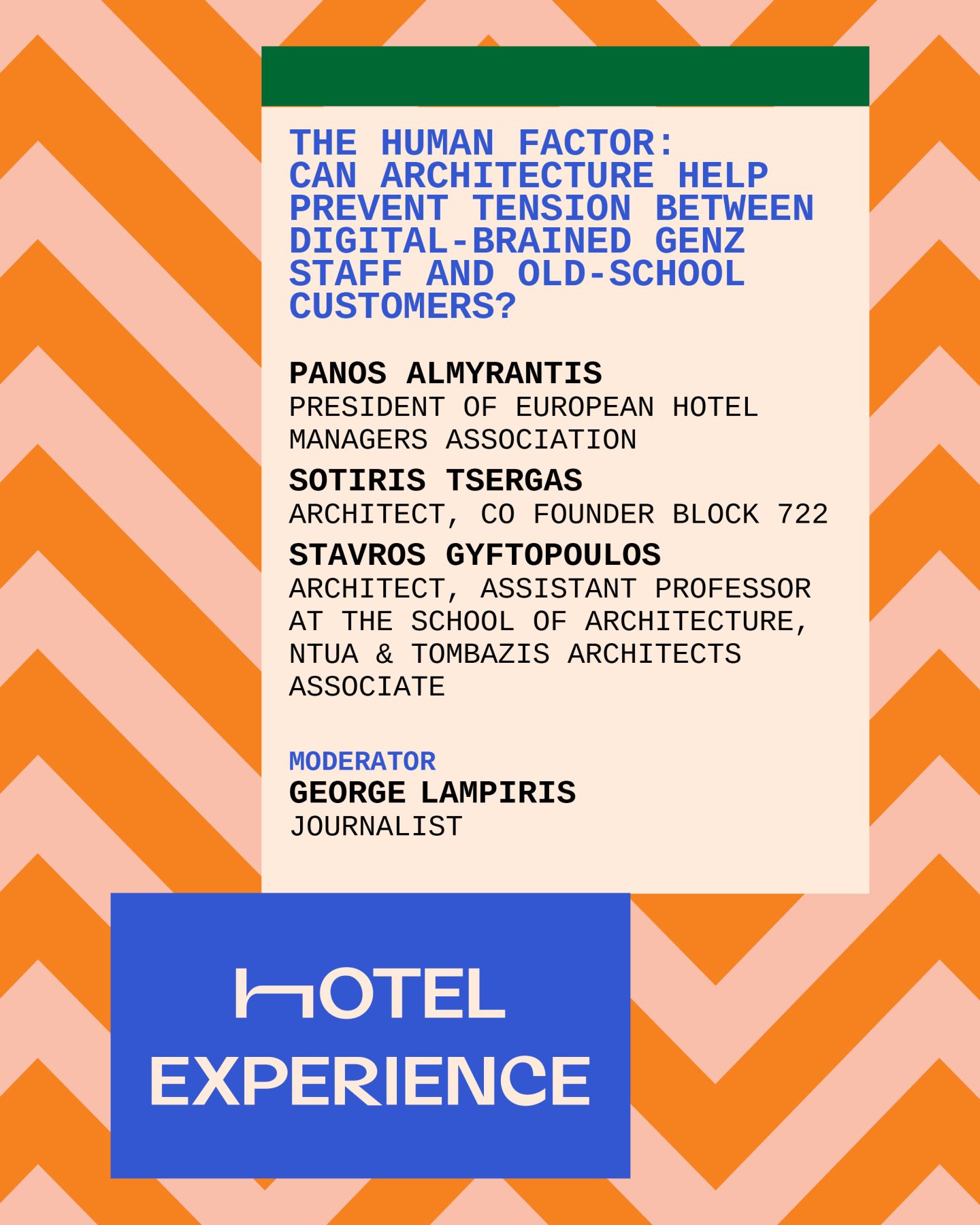 Το Σαββατοκύριακο 18–19 Οκτωβρίου, η Τεχνόπολη του Δήμου Αθηναίων μεταμορφώνεται σε κινηματογραφικό σκηνικό, στο πλαίσιο του Hotel Experience 2025, για να υποδεχτεί ομιλητές και επισκέπτες από όλο το οικοσύστημα της υψηλής φιλοξενίας. Το Σάββατο 18 Οκτωβρίου παρακολουθήστε τη συζήτηση ανάμεσα στον Πάνο Αλμυράντη (President of European Hotel Managers Association, ELLA Resorts Chief Growth & Commercial Officer ), τον Σωτήρη Τσέργα (Architect, Co Founder Block 722), τον Σταύρο Γυφτόπουλο (Architect, Assistant Professor at the School of Architecture, NTUA & Tombazis Architects Associate), με συντονιστή τον Γιώργο Λαμπίρη (Journalist Powergame.gr / Parapolitika FM) σχετικά με το πως ο χωρικός σχεδιασμός μπορεί να διαμεσολαβήσει στις εντάσεις που προκύπτουν στη σχέση της Gen Z όταν έρχεται αντιμέτωπη με ένα πελατολόγιο άλλης γενιάς στο εργασιακό περιβάλλον.