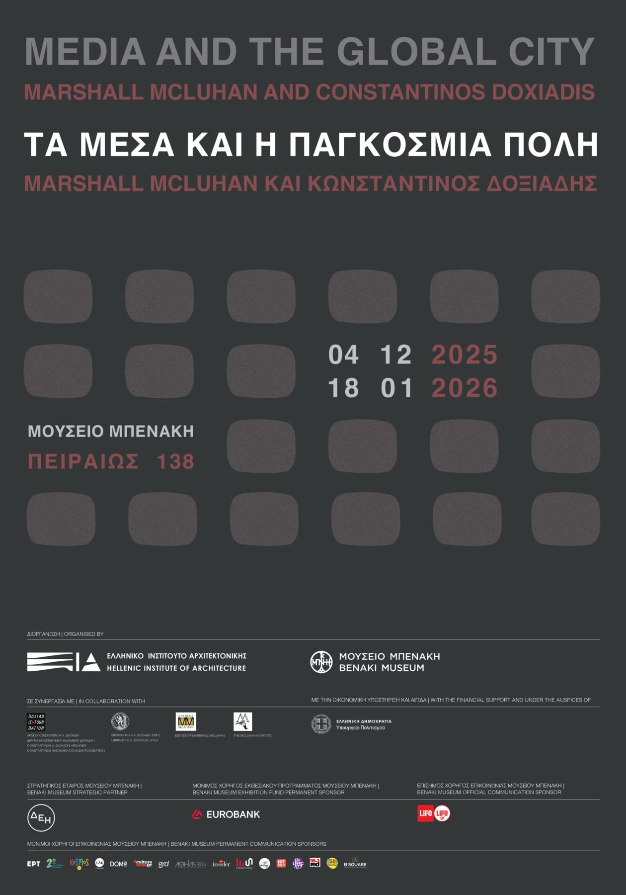 Πενήντα χρόνια από τον θάνατο του Κωνσταντίνου Α. Δοξιάδη, το Ελληνικό Ινστιτούτο Αρχιτεκτονικής σε συνεργασία με το Μουσείο Μπενάκη τιμά τον πρωτοπόρο Έλληνα αρχιτέκτονα και πολεοδόμο του 20ού αιώνα και παρουσιάζει την έκθεση «Τα Μέσα και η Παγκόσμια Πόλη: Marshall McLuhan και Κωνσταντίνος Δοξιάδης». Η έκθεση εγκαινιάζεται τη Δευτέρα 1 Δεκεμβρίου 2025 στις 19:00 στο Μουσείο Μπενάκη / Πειραιώς 138 και θα διαρκέσει μέχρι τις 18 Ιανουαρίου 2026. Η έκθεση εστιάζει στη συνεργασία του Marshall McLuhan (1911-1980) με τον Κωνσταντίνο Α. Δοξιάδη (1913-1975) μέσα από αρχειακά τεκμήρια, κάποια από τα οποία έρχονται στο φως για πρώτη φορά (αλληλογραφία, αρθρογραφία, πρακτικά επιστημονικών συναντήσεων, σχέδια, φωτογραφίες, αποσπάσματα φιλμ κ.ά.). Την έκθεση επιμελείται ο αναπληρωτής καθηγητής ΕΜΠ Κώστας Τσιαμπάος.