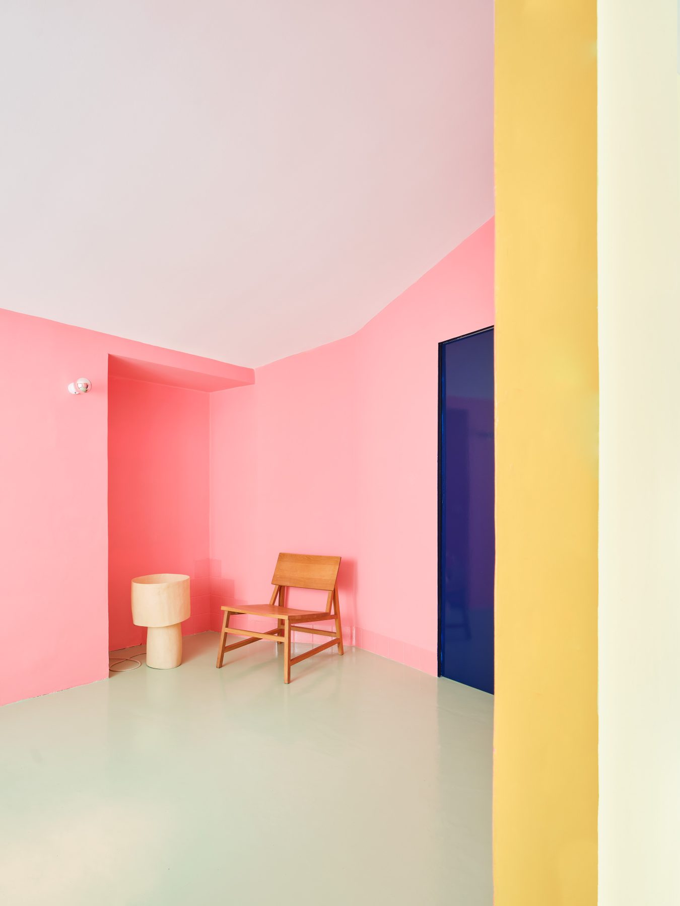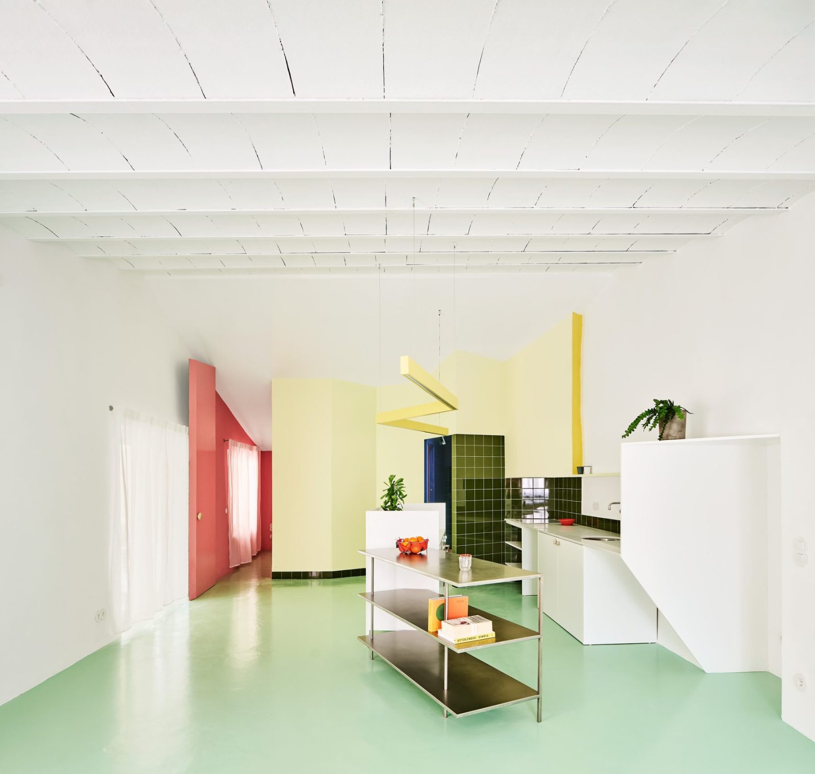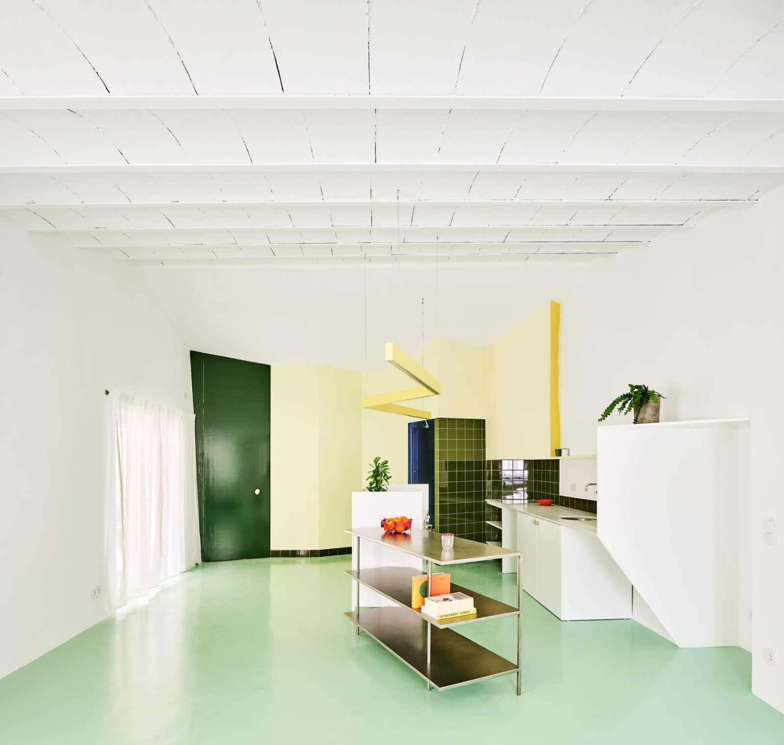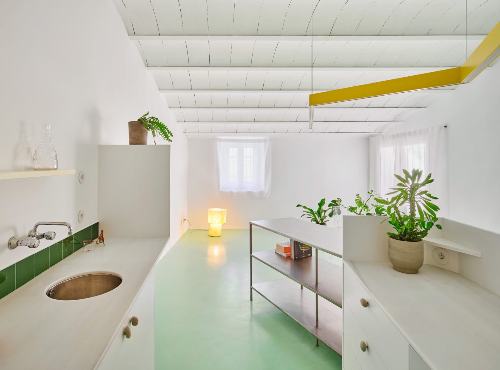 A deep ocean blue speaks for the bathroom, a baby pink for the sleeping chamber, while a mixture of pale yellow, cypress, and pistachio green upholsters the surfaces that make the kitchen happen. White curtains, cupboards, ceilings, and walls counterbalance the outgoing expressiveness of the colorful bricolage, grounding the home in its earthy background.