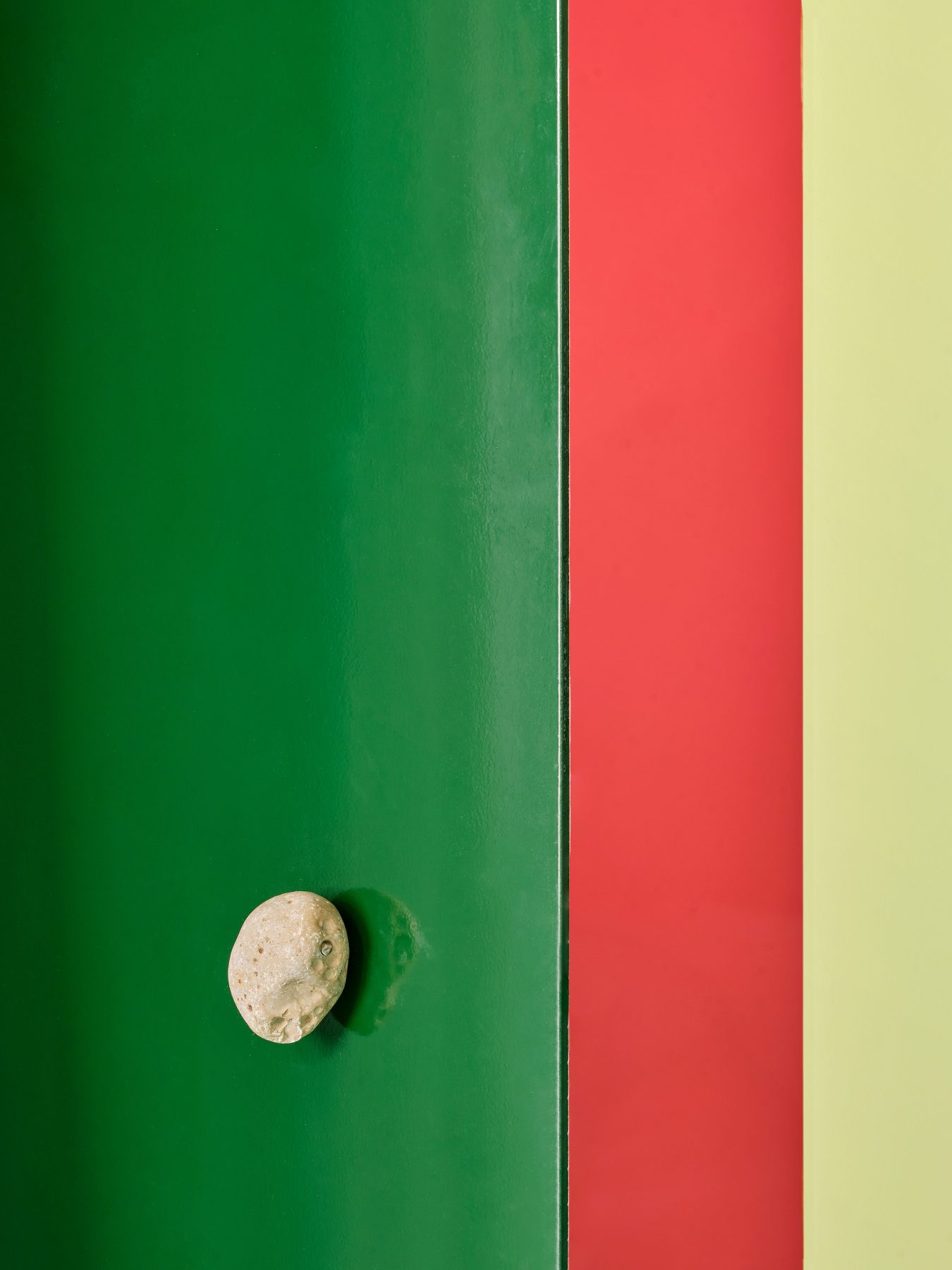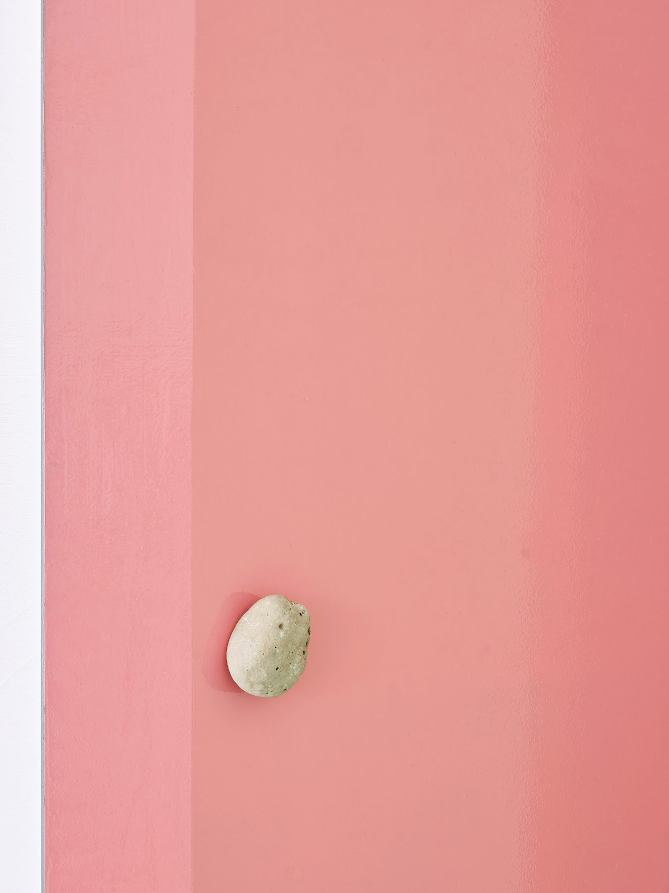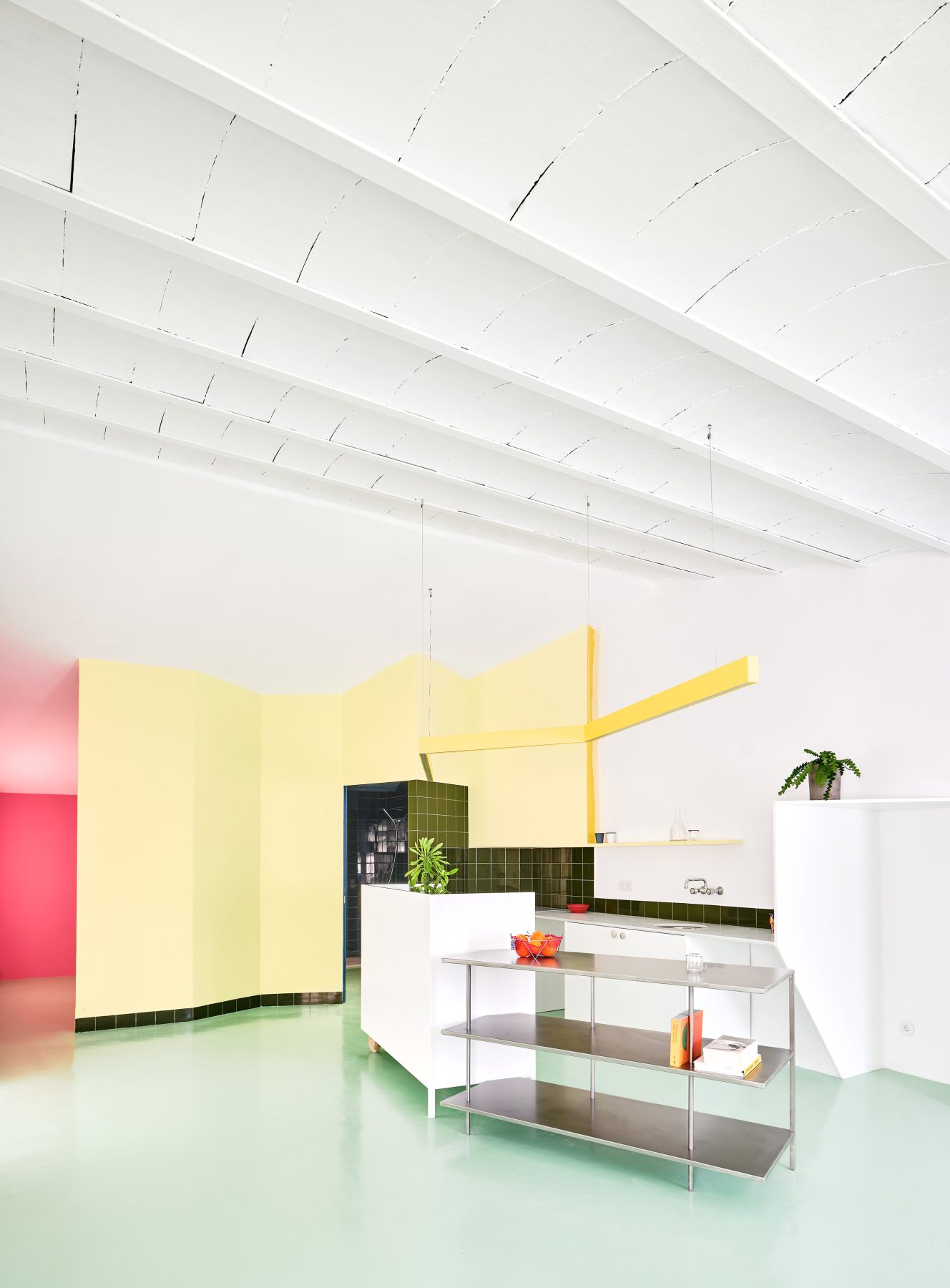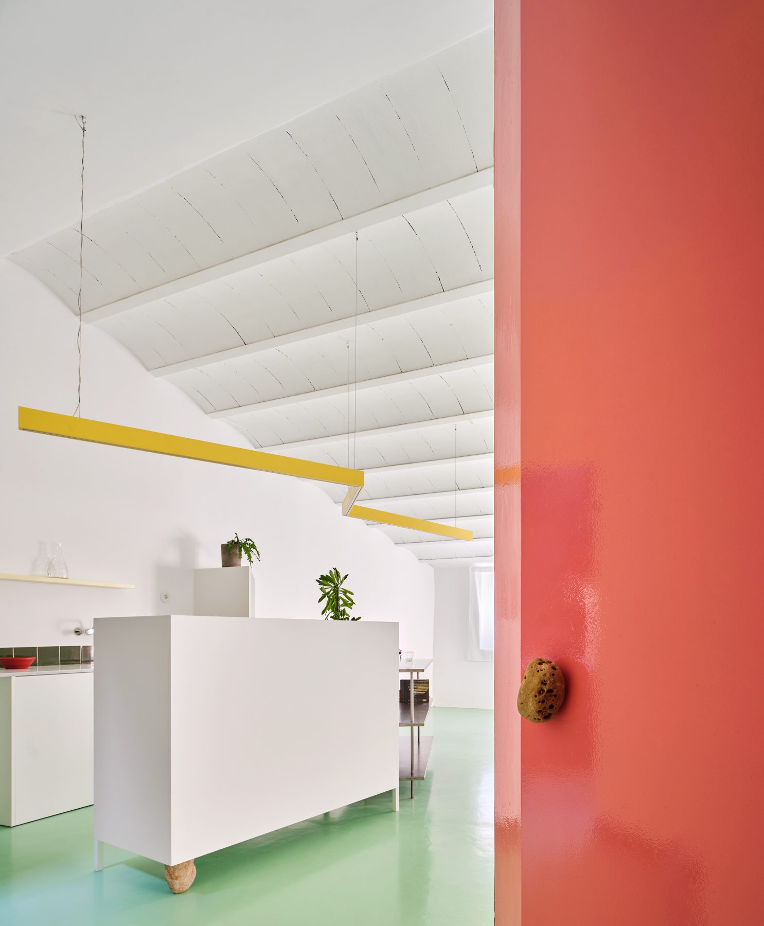 A deep ocean blue speaks for the bathroom, a baby pink for the sleeping chamber, while a mixture of pale yellow, cypress, and pistachio green upholsters the surfaces that make the kitchen happen. White curtains, cupboards, ceilings, and walls counterbalance the outgoing expressiveness of the colorful bricolage, grounding the home in its earthy background.
