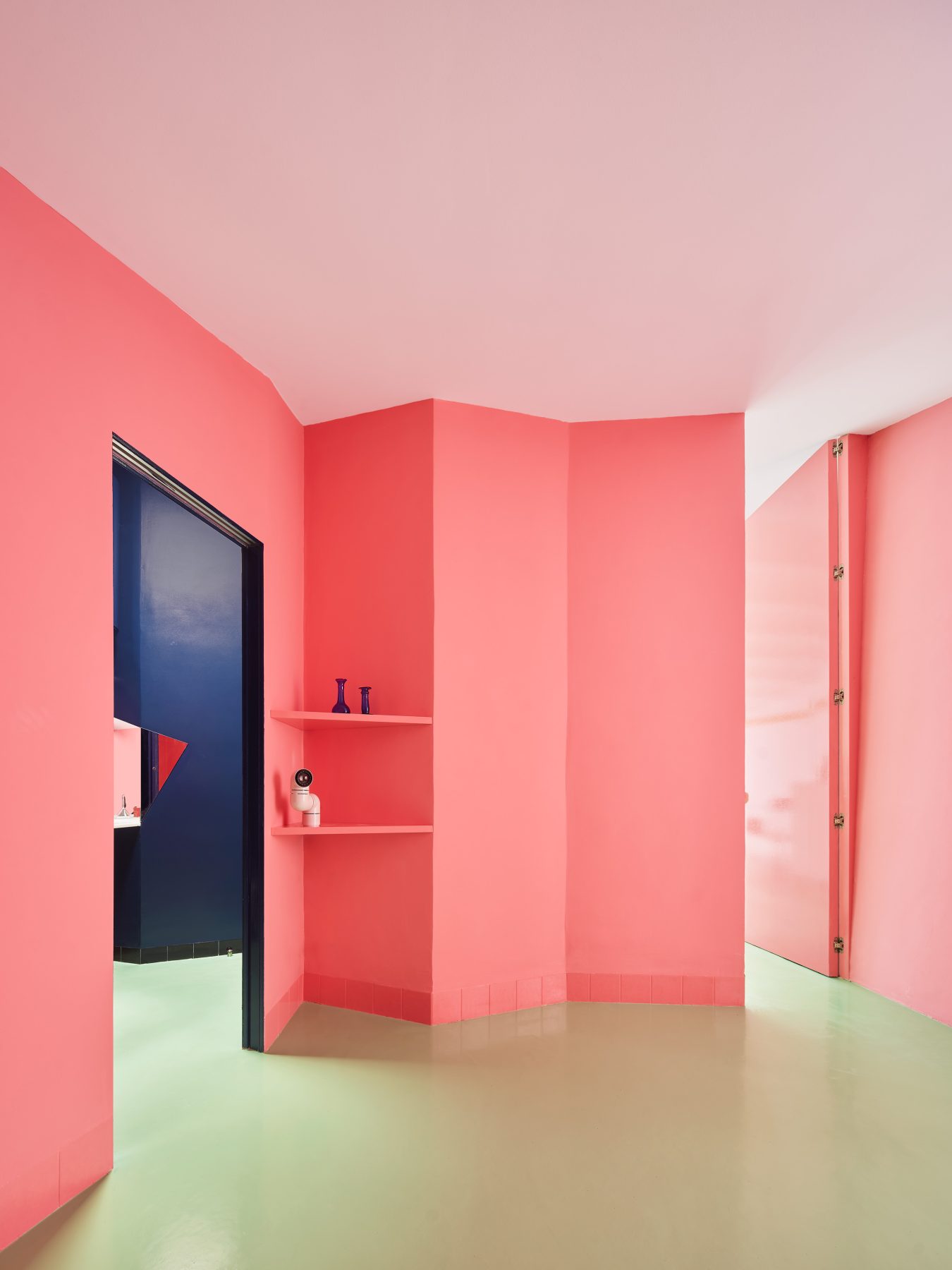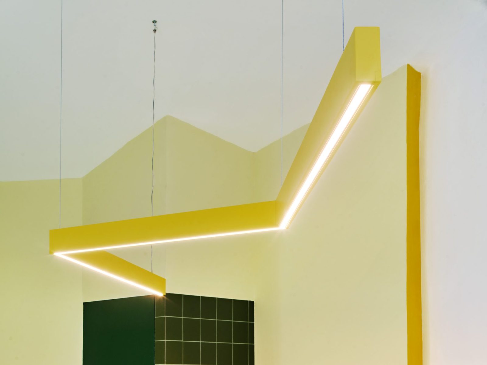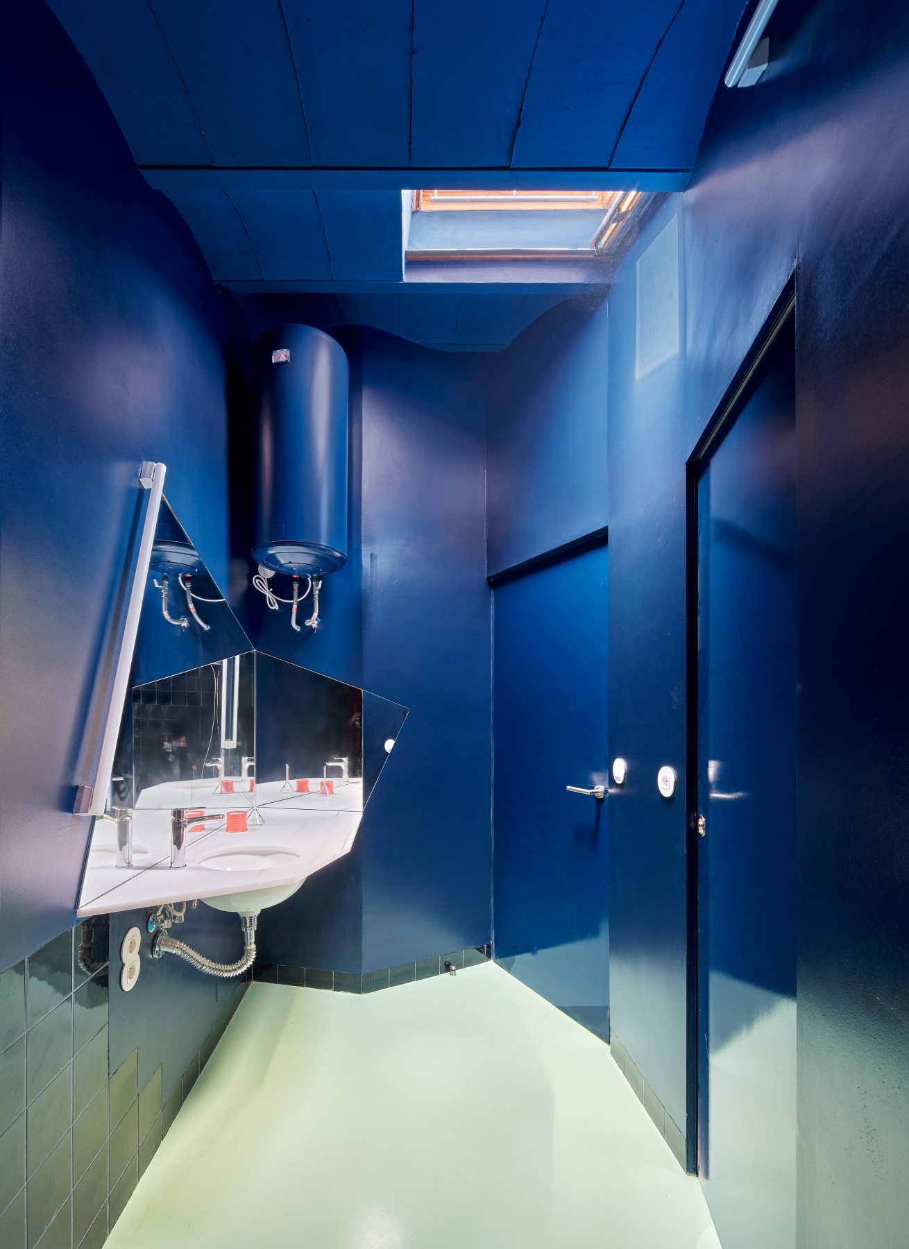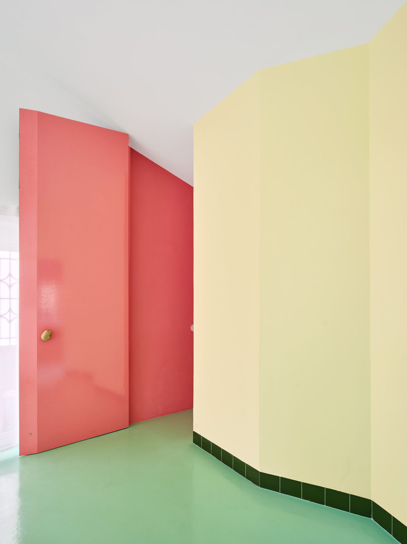 The zigzagged interior walls of the gable-roofed property delineate the different domestic areas, marked by vibrant color choices impossible to miss. “Relampago House is a project that speaks of one of our great concerns in spatial exploration: morphology and colour approached through fantasy,” say the architects.