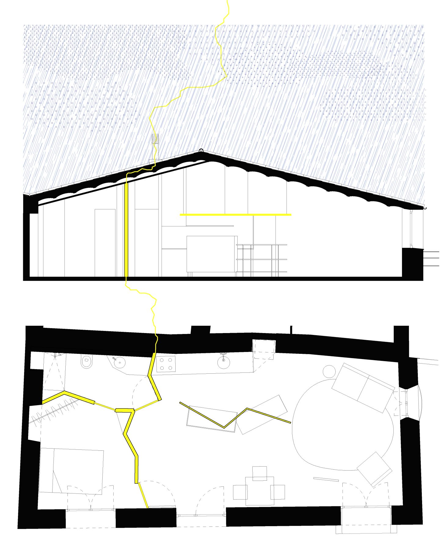 As pure electricity, the uncontrollable nature of lightning turns it into a deeply transformative force that reconfigures matter. From this electrical starting point, Adrià Orriols, Joan Gener, and Miquel Ruiz, the founders of H3o Architects, renovated a modest 55 m² old barn situated within the historic rural estate Can Cardona in the small town of Sant Just Desvern on the outskirts of Barcelona, inspired by the legend of the lightning that struck the traditional Catalan farmhouse many years ago.