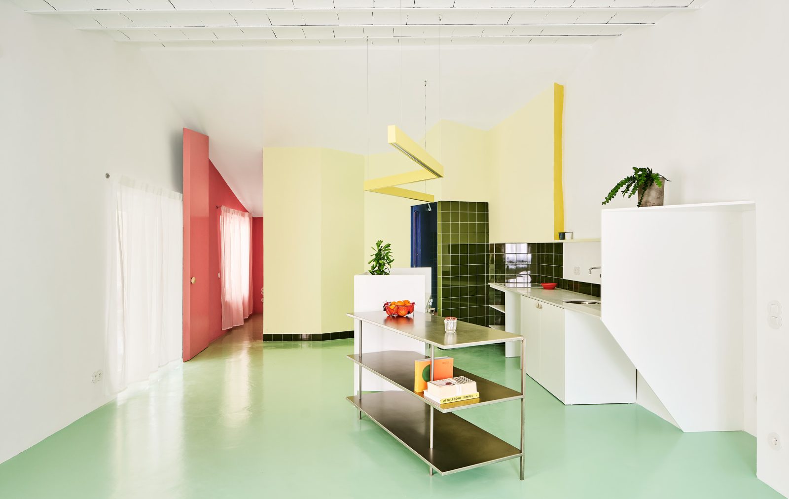 A deep ocean blue speaks for the bathroom, a baby pink for the sleeping chamber, while a mixture of pale yellow, cypress, and pistachio green upholsters the surfaces that make the kitchen happen. White curtains, cupboards, ceilings, and walls counterbalance the outgoing expressiveness of the colorful bricolage, grounding the home in its earthy background.