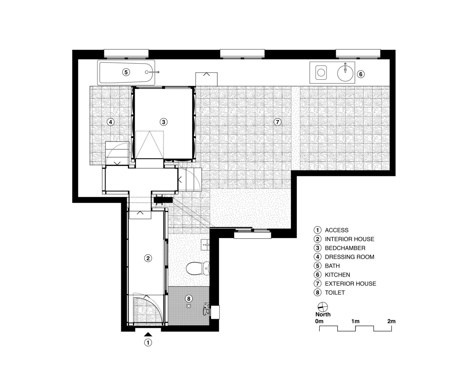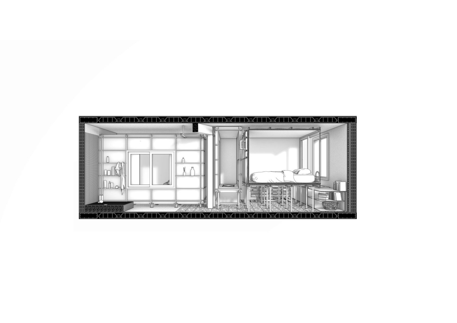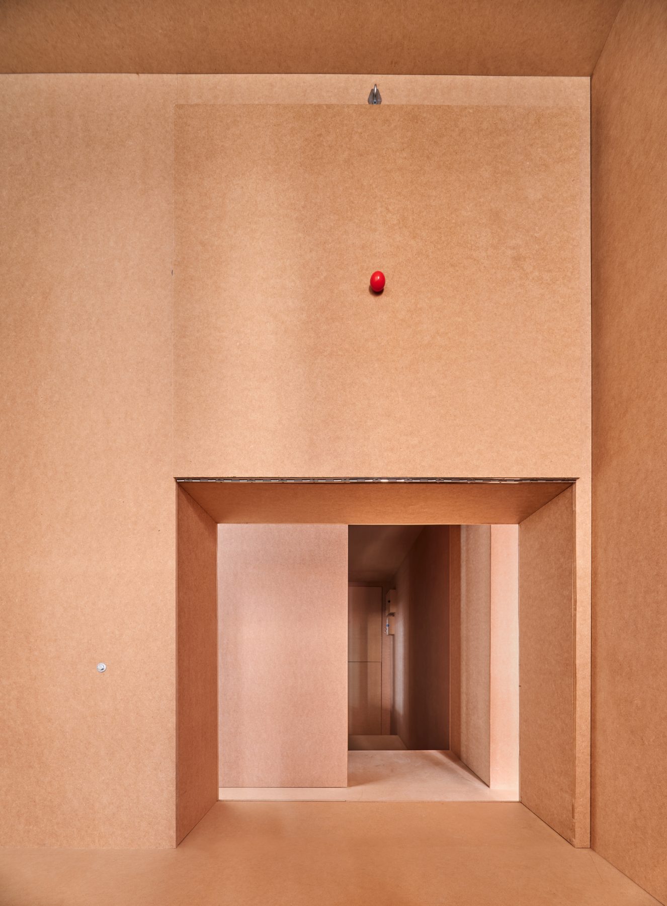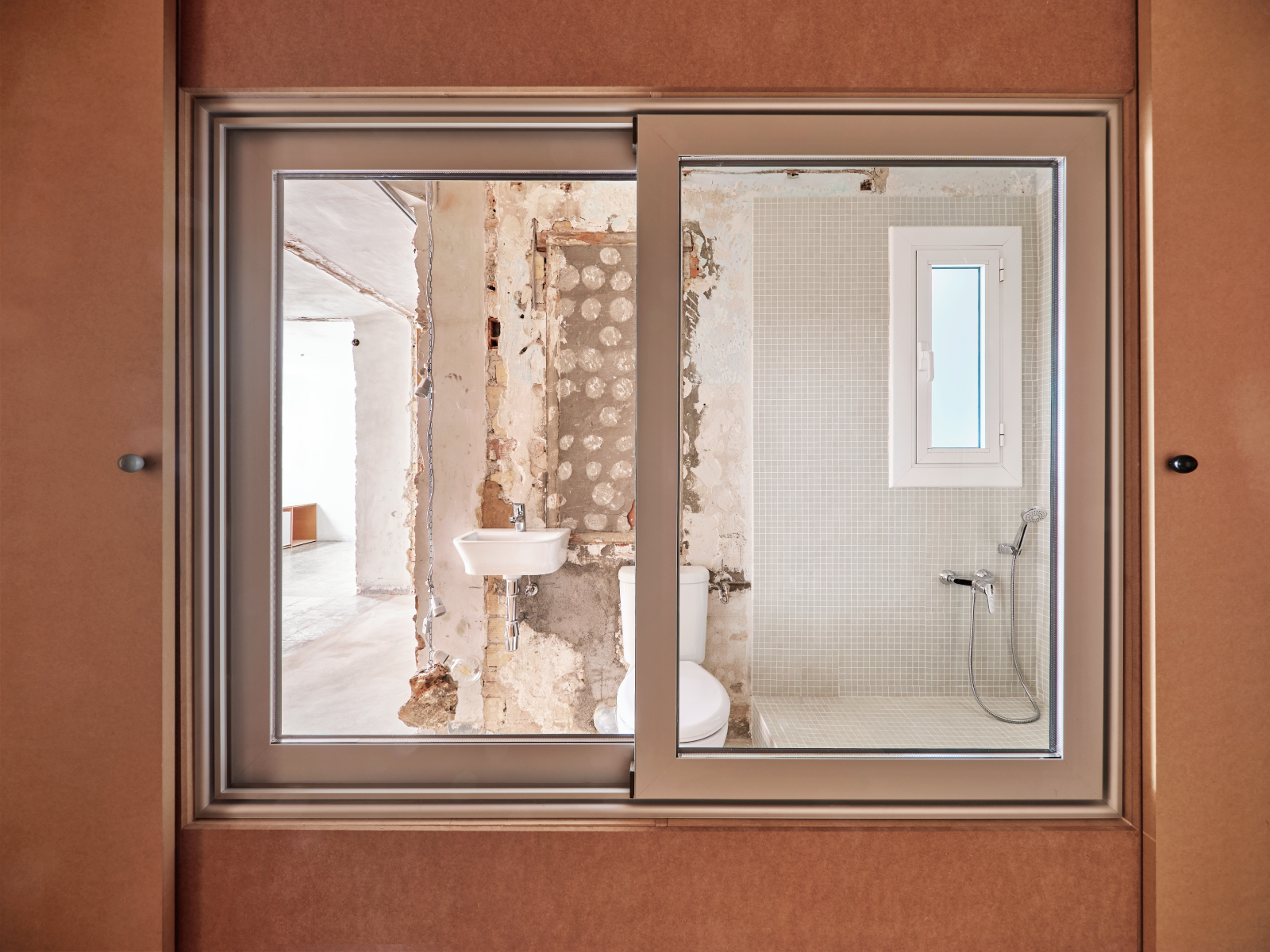 Extending this logic, the architects introduced an internal window between the entrance corridor and the bathroom. Once again, the naked body is exposed—this time as a hedonistic spectacle—transforming the bathroom from a secluded, utilitarian enclosure into a space “that can be used even in company”, social and luminous rather than isolated and opaque.