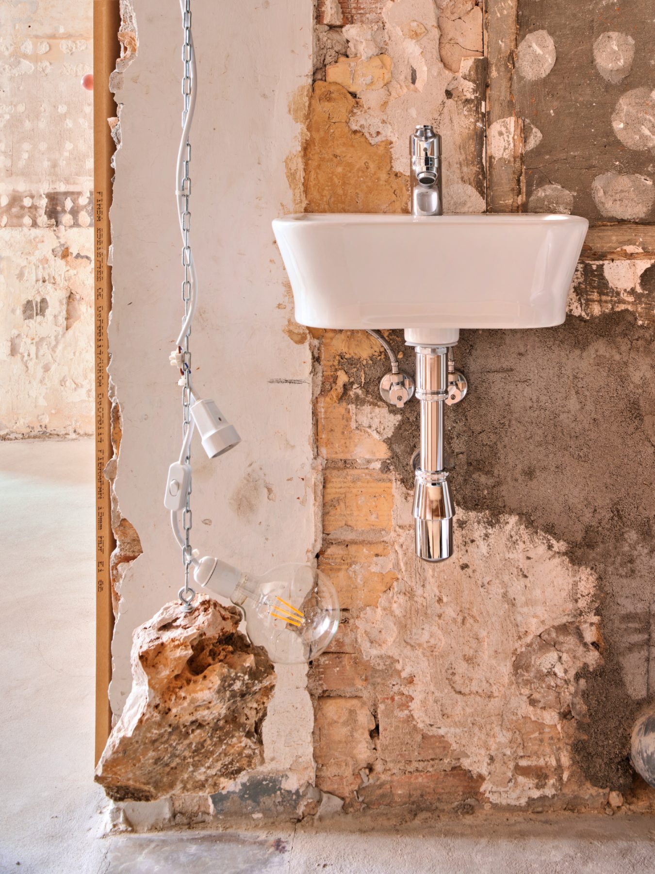 Traces of removed partitions and dismantled light fixtures remain visible, lending the apartment a raw, brutal honesty while preserving the memory of its former layout.