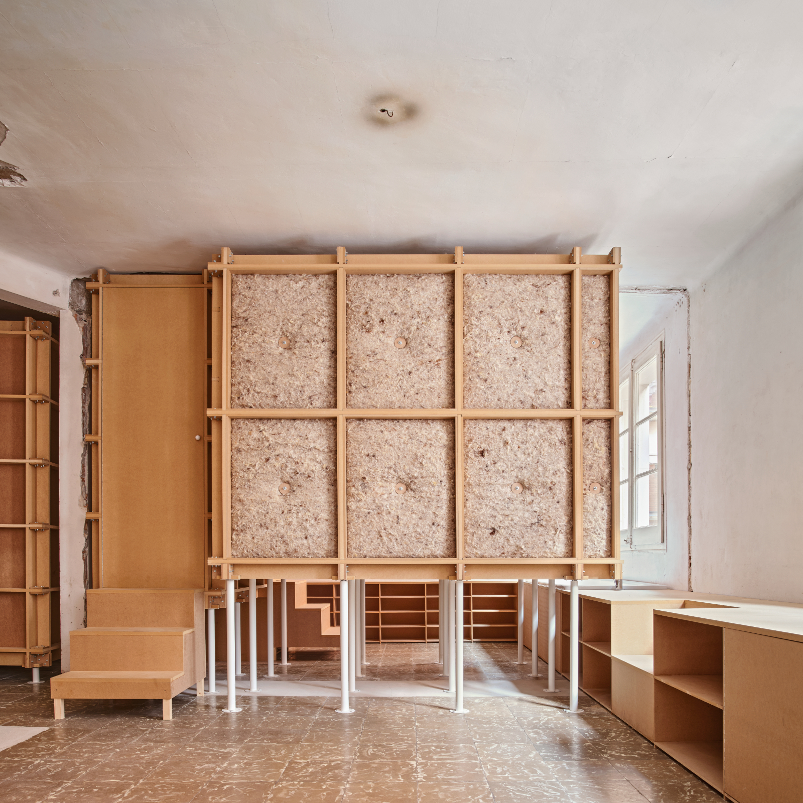Elevated on white recycled table legs, the home’s new built elements allow water pipes and electrical conduits to run freely around them, eliminating the need for wall chases and significantly reducing construction time and cost. At the heart of the dwelling lies its softest and warmest core—the sleeping chamber. By positioning the room with the greatest thermal demand at the center, the design enhances energy efficiency; its layered, onion-like configuration helps stabilize indoor temperatures and reduces the need for additional heating. For insulation and affordability, the elevated bedroom volume is clad in gridded medium-density fibreboard (MDF) frames enveloped with slabs of locally sourced sheep’s wool.