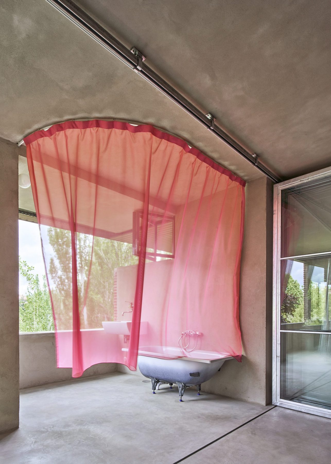 10K House follows The Day After House, a 2021 project by TAKK in Madrid, extending similar out-of-the-box design principles, including a bedroom raised on stilts and a communal outdoor bathtub concealed behind a sheer pink curtain.