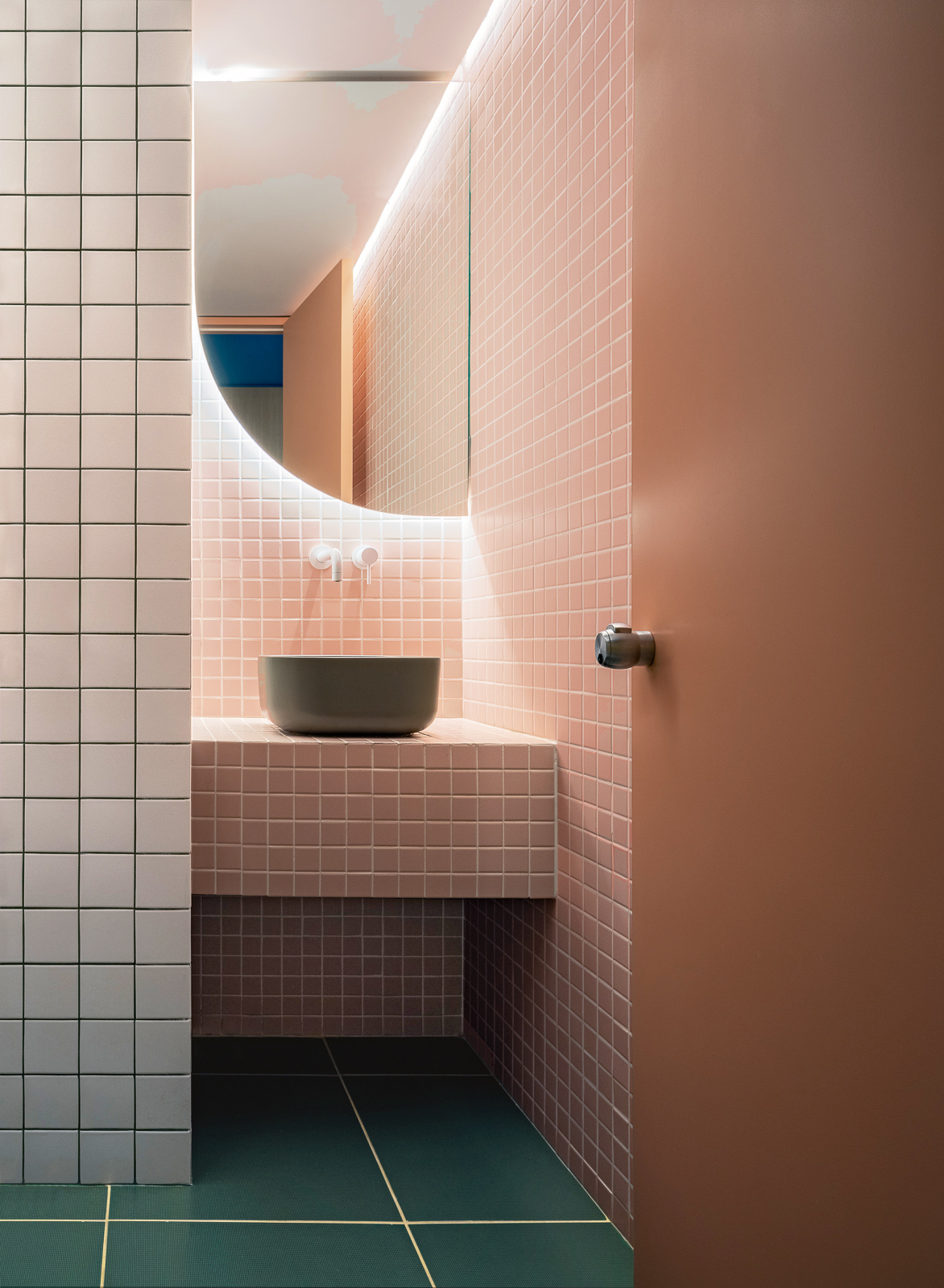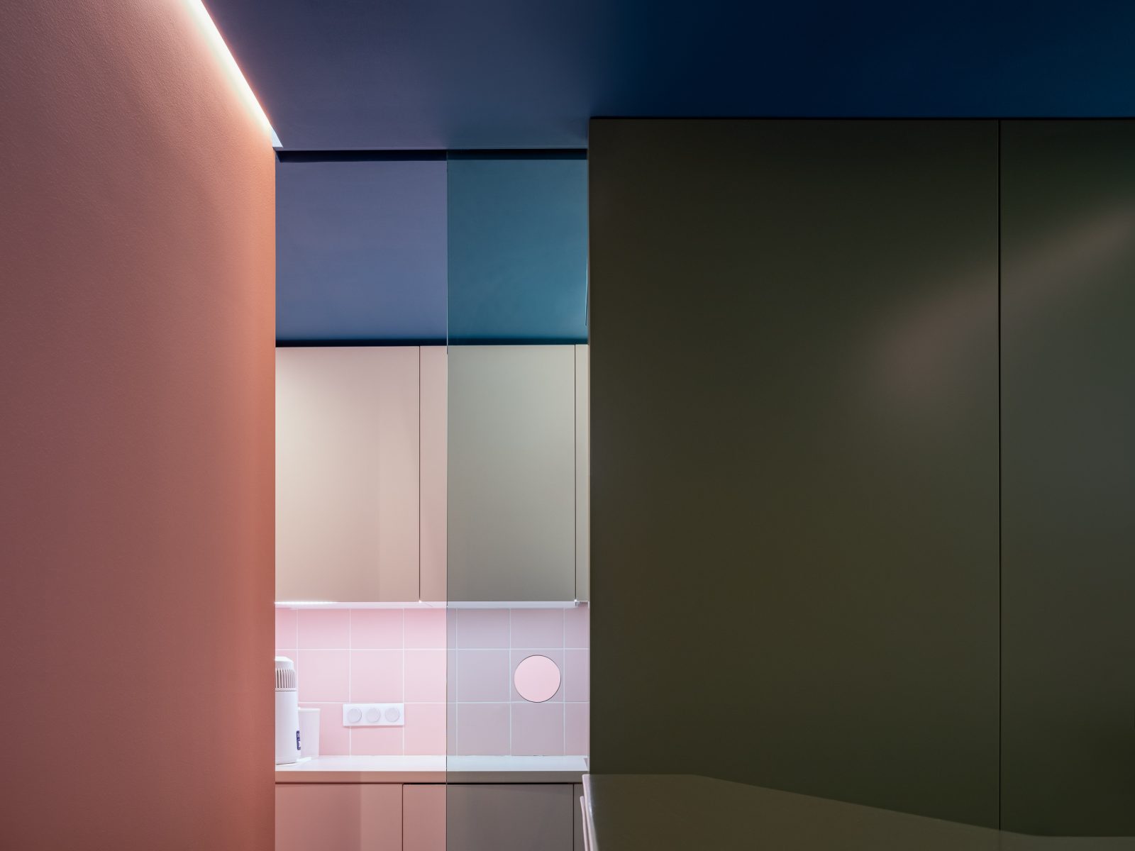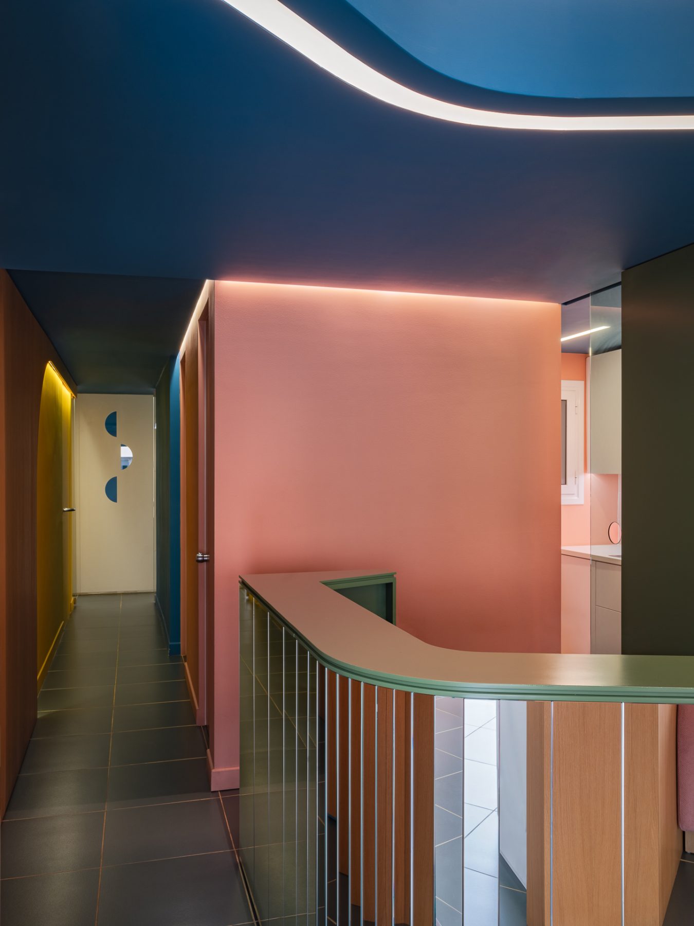 Το κροκί, το λαδί, το πετρόλ και το ροζ συμπληρώνουν το ένα το άλλο για να ζωντανέψουν τοίχους και οροφές, τονίζοντας το παιχνίδι των κλιμακωτών επιπέδων και καμπυλών. Αυτό που προτείνει η Μπέλα Λουλουδάκη είναι η απόλυτη βύθιση σε έναν πολύπλευρο χρωματικό ορίζοντα.